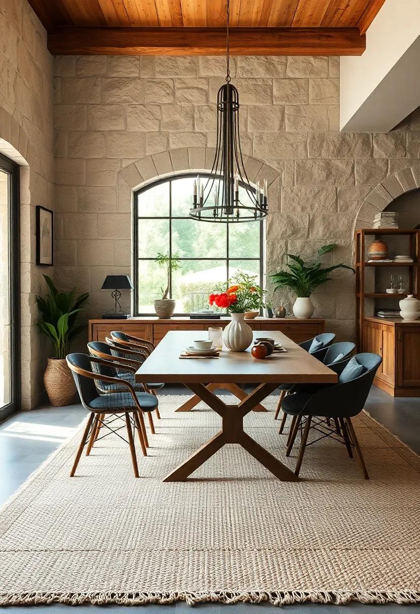 Natural fiber rugs: Lay down a natural fiber rug to anchor the dining table while adding texture and warmth to your rustic aesthetic