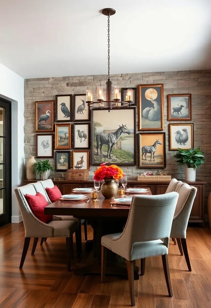Vintage artwork: Frame vintage prints or family photos to create a gallery wall that personalizes your dining room while contributing to a rustic charm