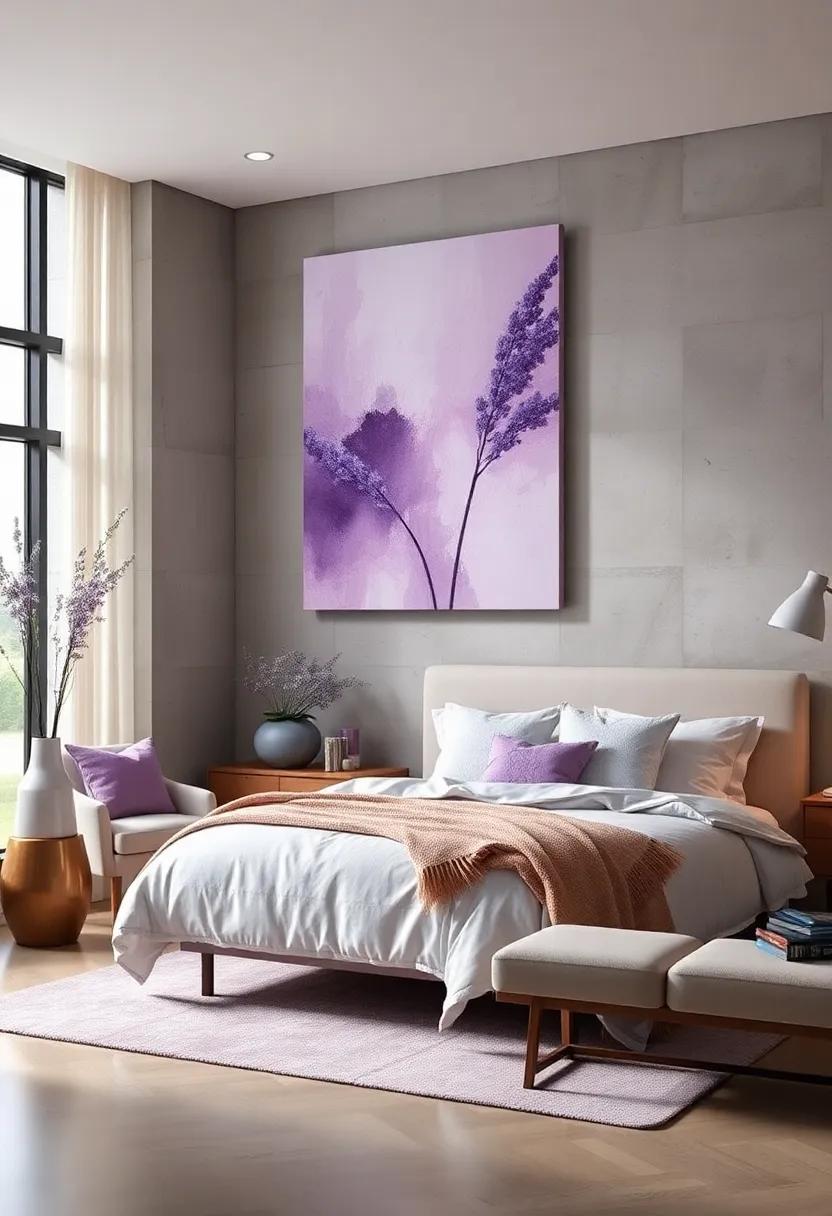 Lavender-Inspired Art: Hang framed artwork featuring lavender fields or abstract lavender hues to reinforce the theme while adding a sophisticated focal point