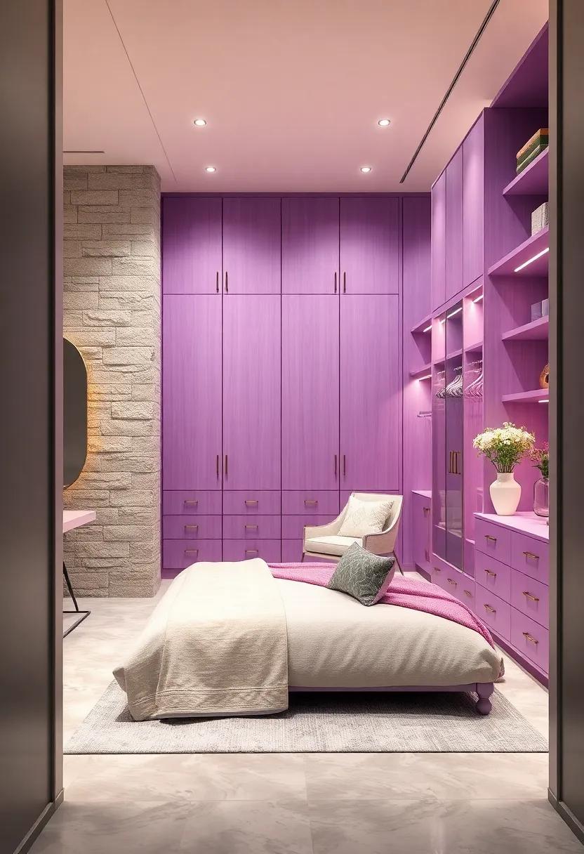 Transform your walk-in closet into a sumptuous retreat with the enchanting charm of lavender. Choose deep lavender accent walls to create a gentle yet sophisticated backdrop that reflects elegance. Pair these walls with custom cabinetry in soft pastel hues for a cohesive look that feels both modern and inviting. Utilize mirrored finishes on your closet doors to enhance light and create a sense of space,while delicate,plush textiles can be used for seating or accessories. Incorporate gold or brass accents in hardware and lighting fixtures to add a touch of opulence, showcasing your exquisite taste.