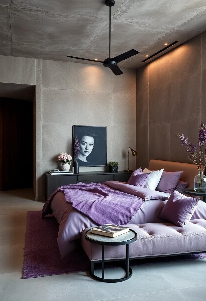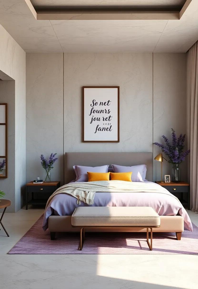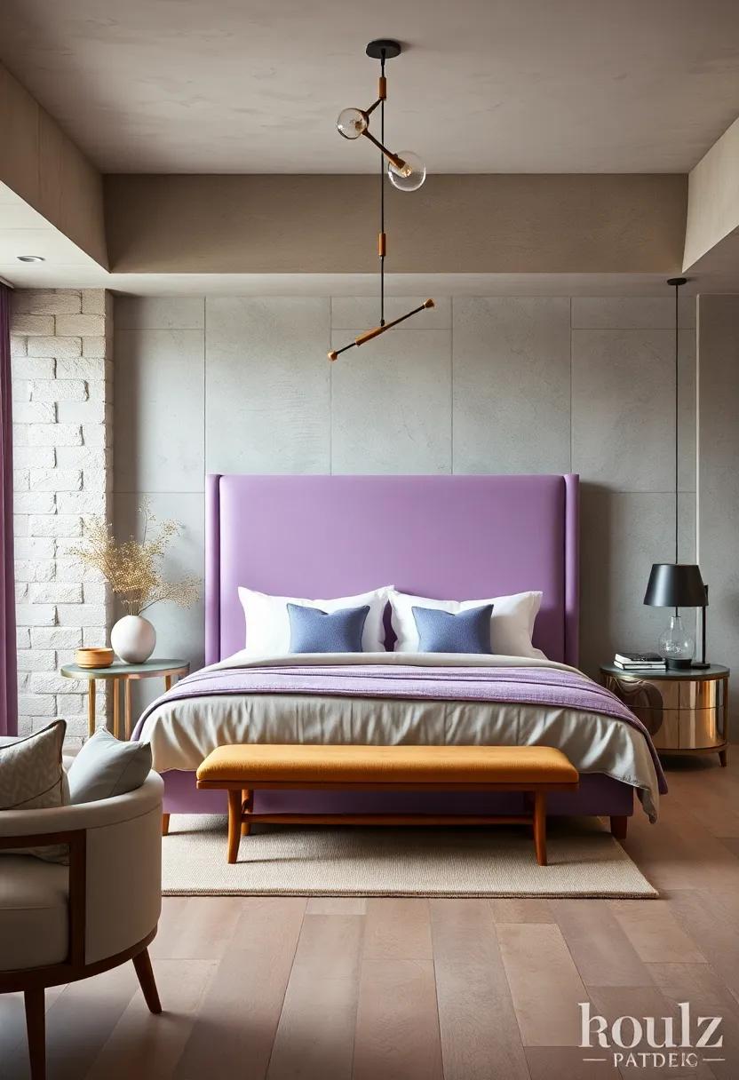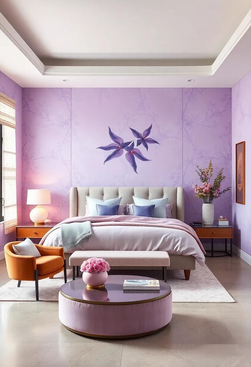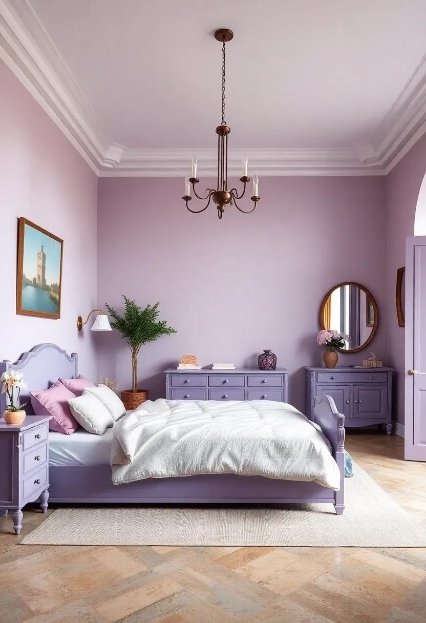 Using dark wood or rich black accents against the soft backdrop of lavender creates a visual harmony that is both striking and graceful. Imagine a plush lavender duvet draped over a sleek ebony bed frame, enveloping the space in an air of elegance. To elevate this combination, consider incorporating pieces like a mid-century modern dresser or classic black nightstands. Not only do these furnishings ground the delicate lavender tones, but they also introduce a touch of sophistication that can redefine your bedroom aesthetic. Accent pieces, such as a dark wood bench at the foot of the bed or a black metal framed mirror, further enhance this luxurious vibe while maintaining a sense of calm.