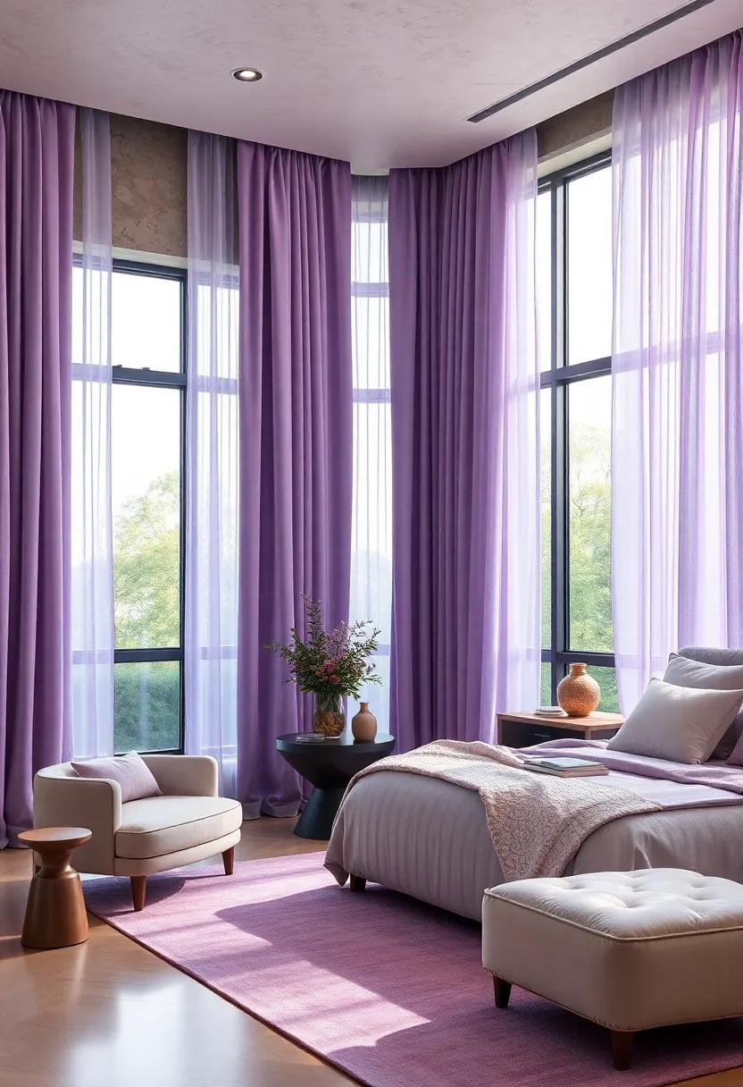 textured Lavender Curtains: Install floor-to-ceiling curtains in a luxurious lavender fabric to frame your windows and allow for soft filtering of natural light