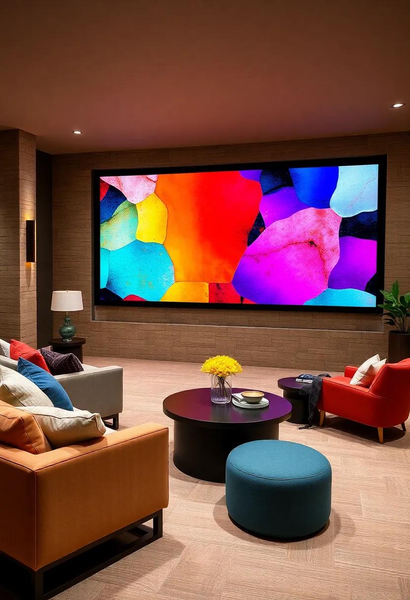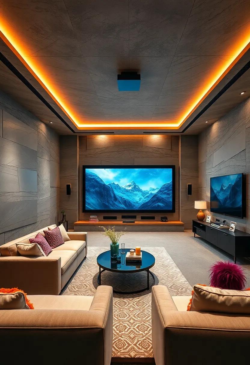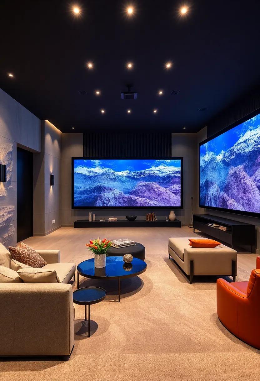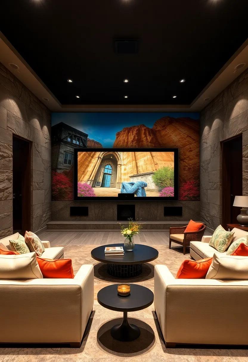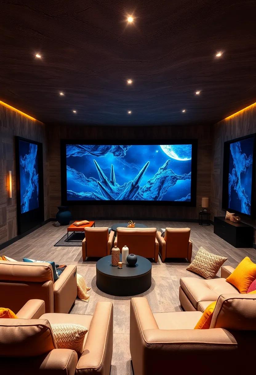 The Mosaic Lounge: Combining vibrant colors⁣ and textured finishes, this home theater​ is highlighted by an engaging 135-inch screen that invites creativity and⁢ artistic⁣ expression into⁢ movie nights