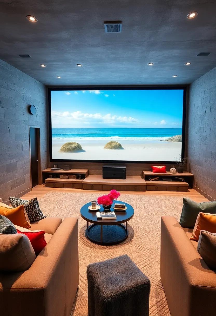The Seaside Retreat: This‌ coastal-themed home theater with a huge 120-inch screen captures the essence of beach life, providing an idyllic setting⁣ for relaxing movie nights