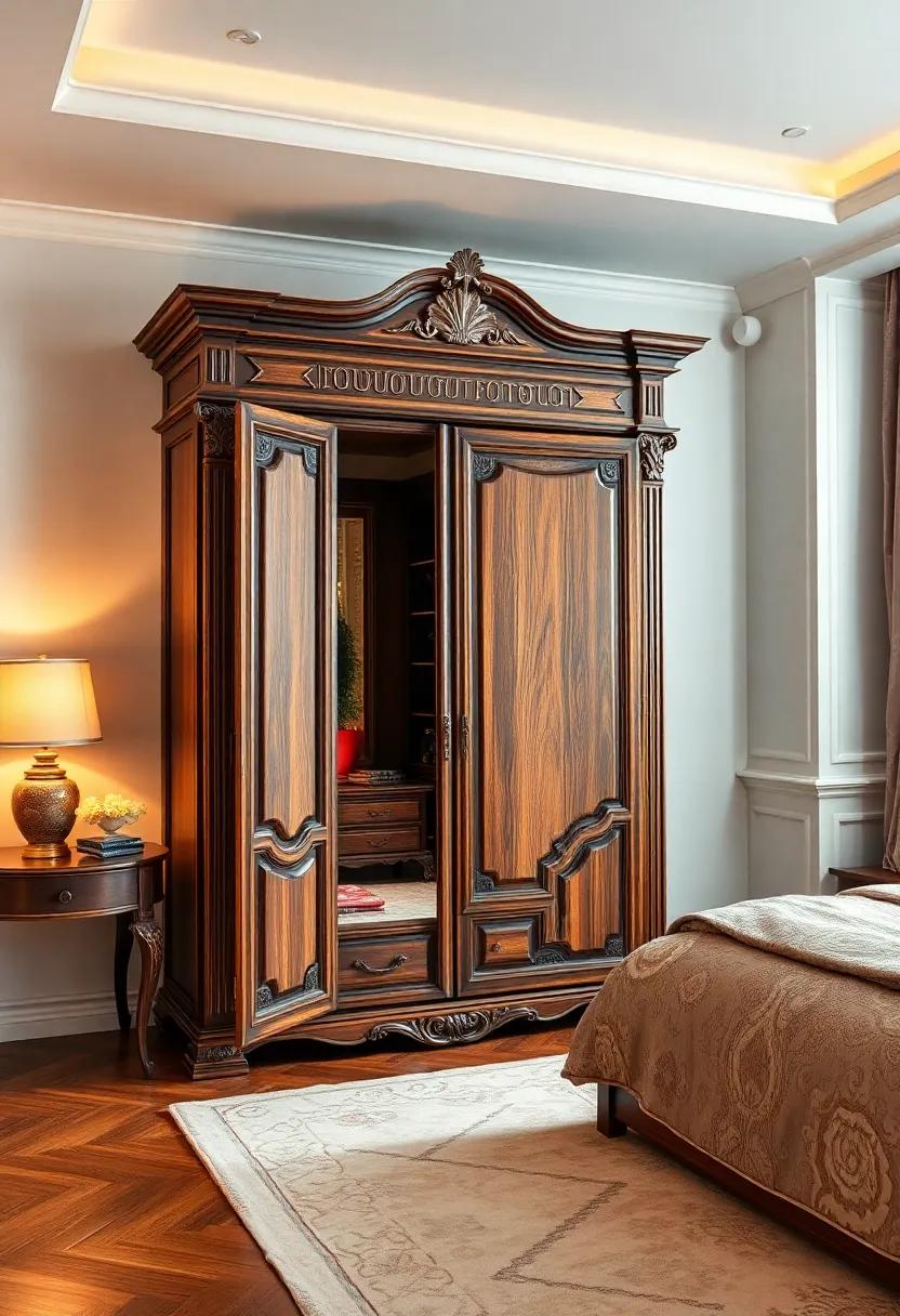 Antique-style Wardrobe: A beautifully crafted wardrobe with intricate detailing serves as both a functional storage solution and a stunning focal point in your room