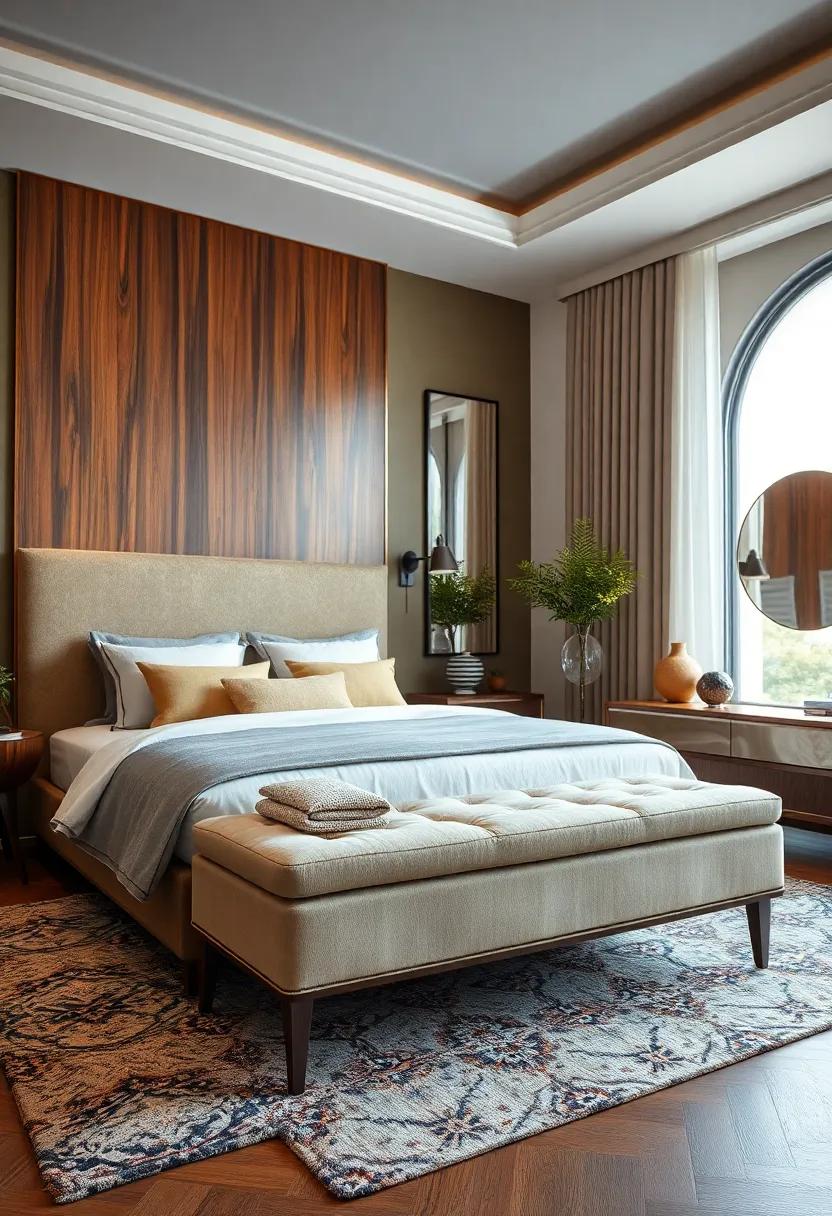 Chic Bench at the Foot of the Bed: A multifunctional piece that serves as a stylish seat and storage solution, perfect for neatly organizing throws and pillows