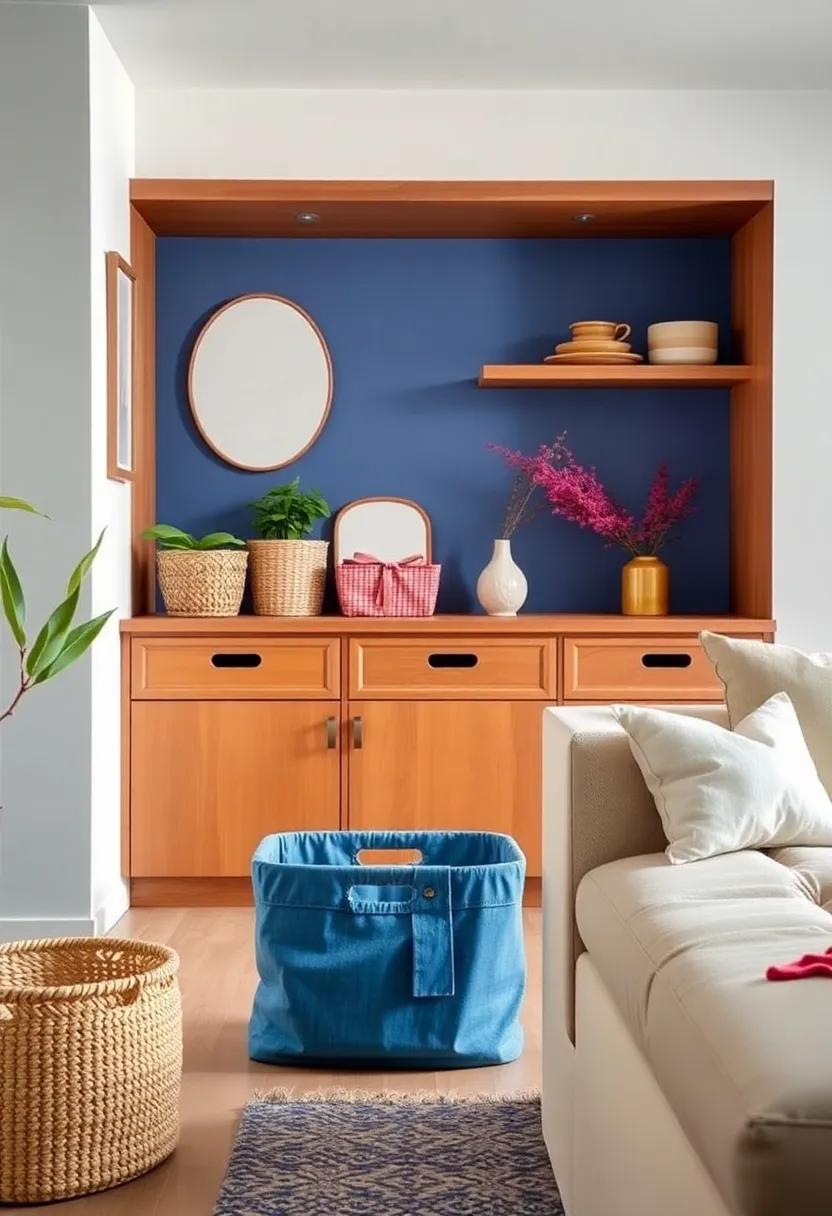 Color-Coordinate Storage: Use baskets and bins in matching colors to add a cohesive look while keeping items organized and out of sight