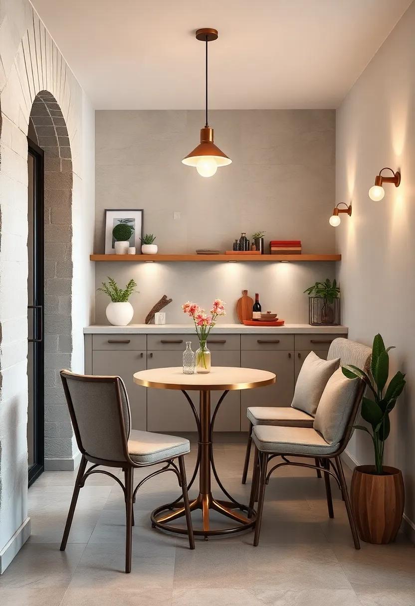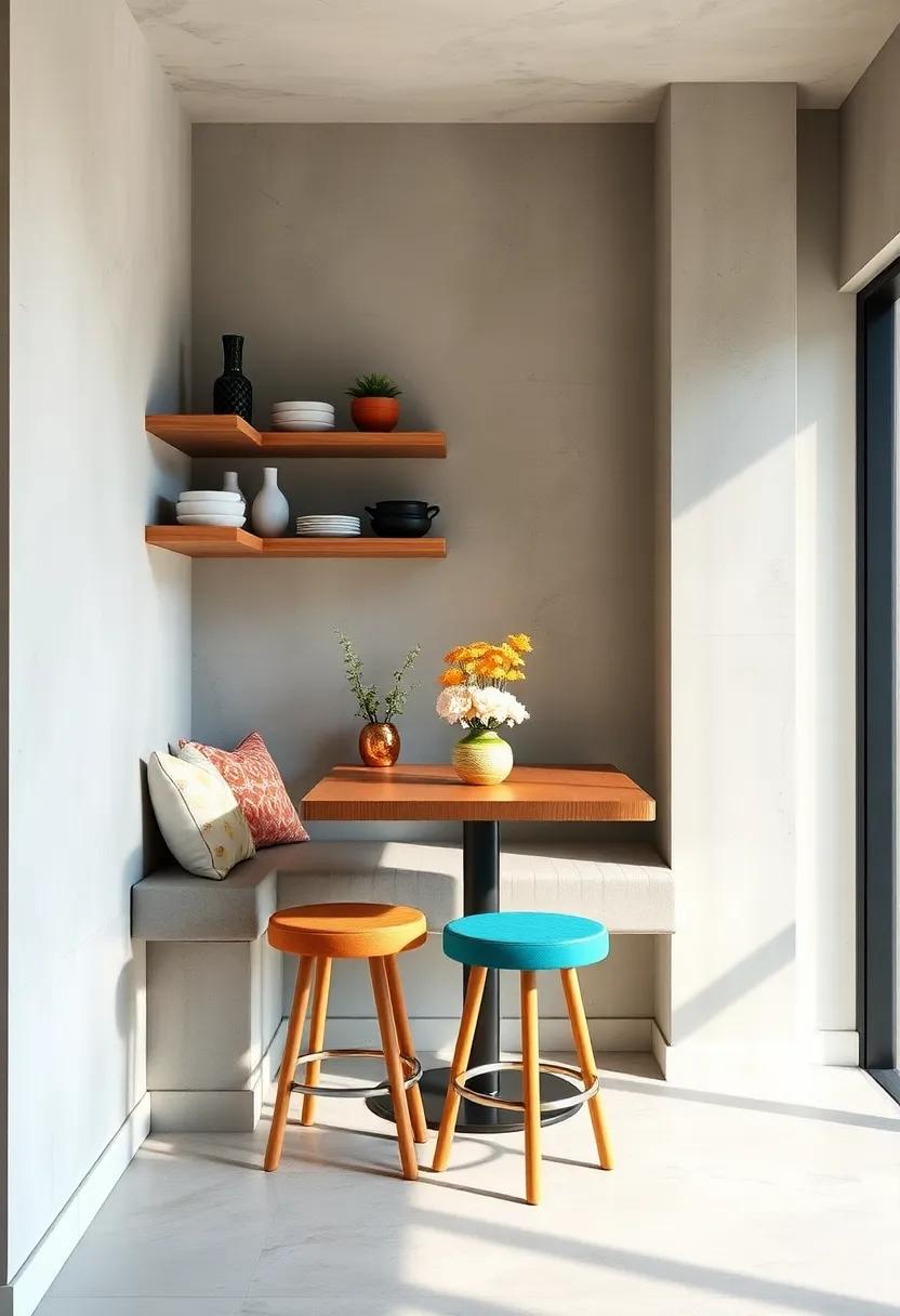 Floating shelves paired with stylish stools can seamlessly transform an idle wall into a charming dining nook that radiates warmth and usability. This idea is perfect for maximizing your space while adding a touch of elegance. By installing shelves at varying heights, you can create a playful visual impact, and it opens up multiple options for displaying knick-knacks, plants, or even your favorite cookbooks. Choosing stools with unique designs—such as those featuring natural wood finishes, sleek metal frames, or colorful upholstery—can enhance the aesthetic appeal and turn functionality into a design statement.