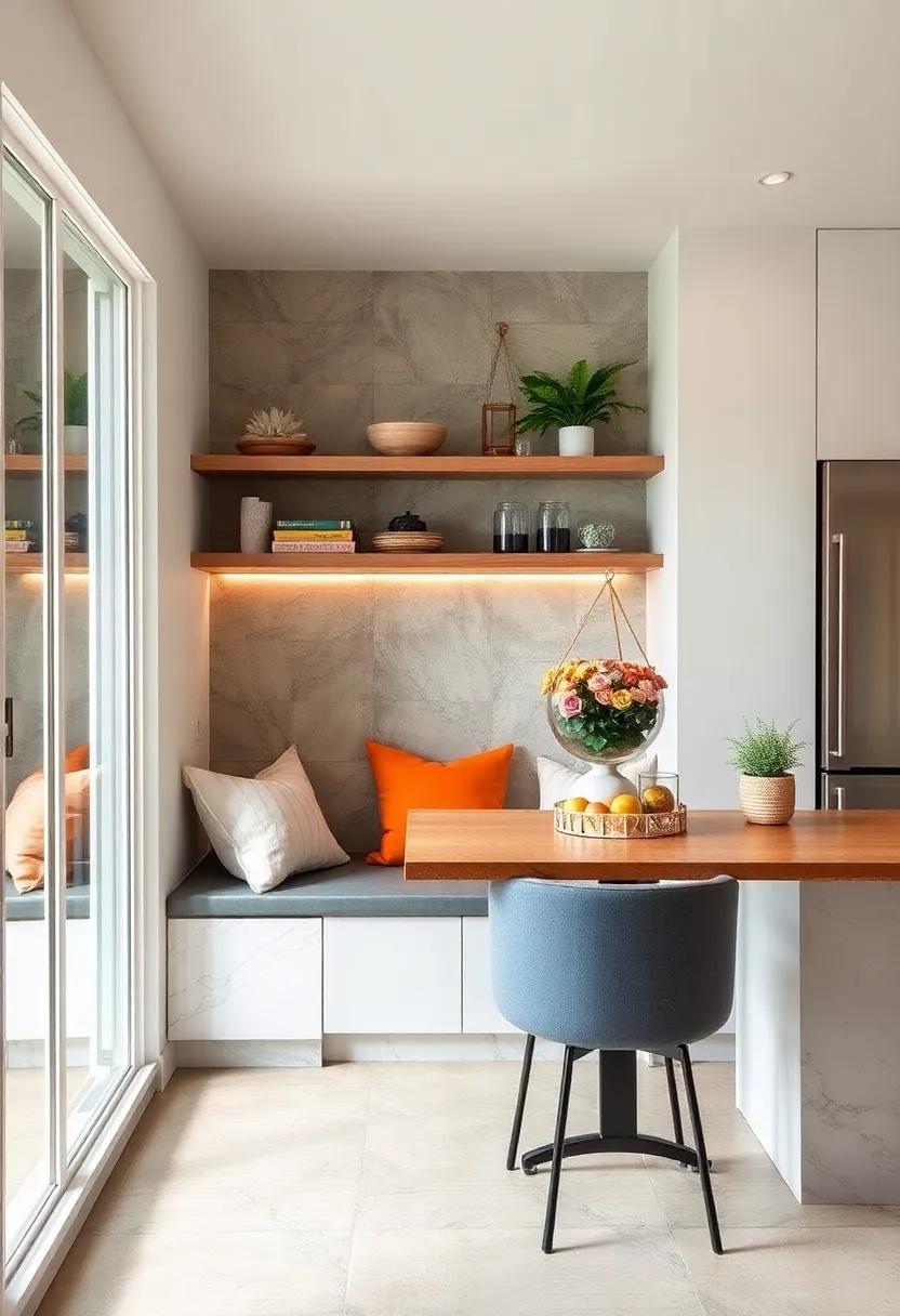 To complete your cozy nook, consider incorporating elements that complement the shelves and seating. Use fabrics that harmonize with your walls or countertop colors, and don’t hesitate to mix textures for added depth. Accent your floating shelves with LED strip lighting that casts a warm glow, inviting you and your guests to linger a bit longer.To further enhance your dining experience, a small built-in table can be created alongside the shelves, allowing for meals or coffee breaks that feel intimate yet spacious. With the right styling, this small setup can indeed feel like a charming café right within the heart of your kitchen.