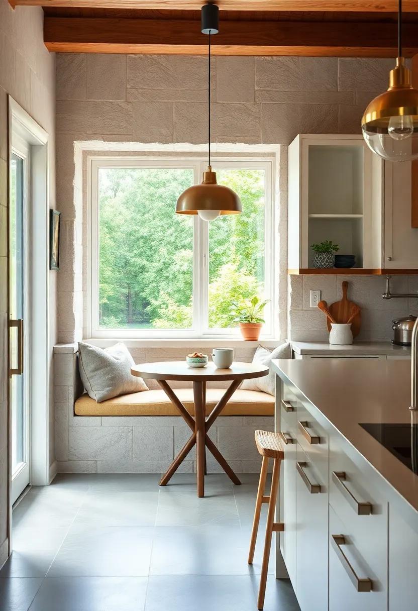 Transform a sunny window into a delightful nook with a cushioned seat that invites you to sip your morning coffee or enjoy a quiet moment with a book. Imagine a built-in bench adorned with plush pillows, creating a cozy spot that enhances the kitchen’s warmth. Using soft, weather-resistant fabrics can make your seating not only stylish but also practical for everyday use.You can layer hues that complement your kitchen’s color palette—think soft pastels or bold patterns that catch the eye. A small table positioned nearby could serve as a perfect place for plants, cookbooks, or afternoon snacks.