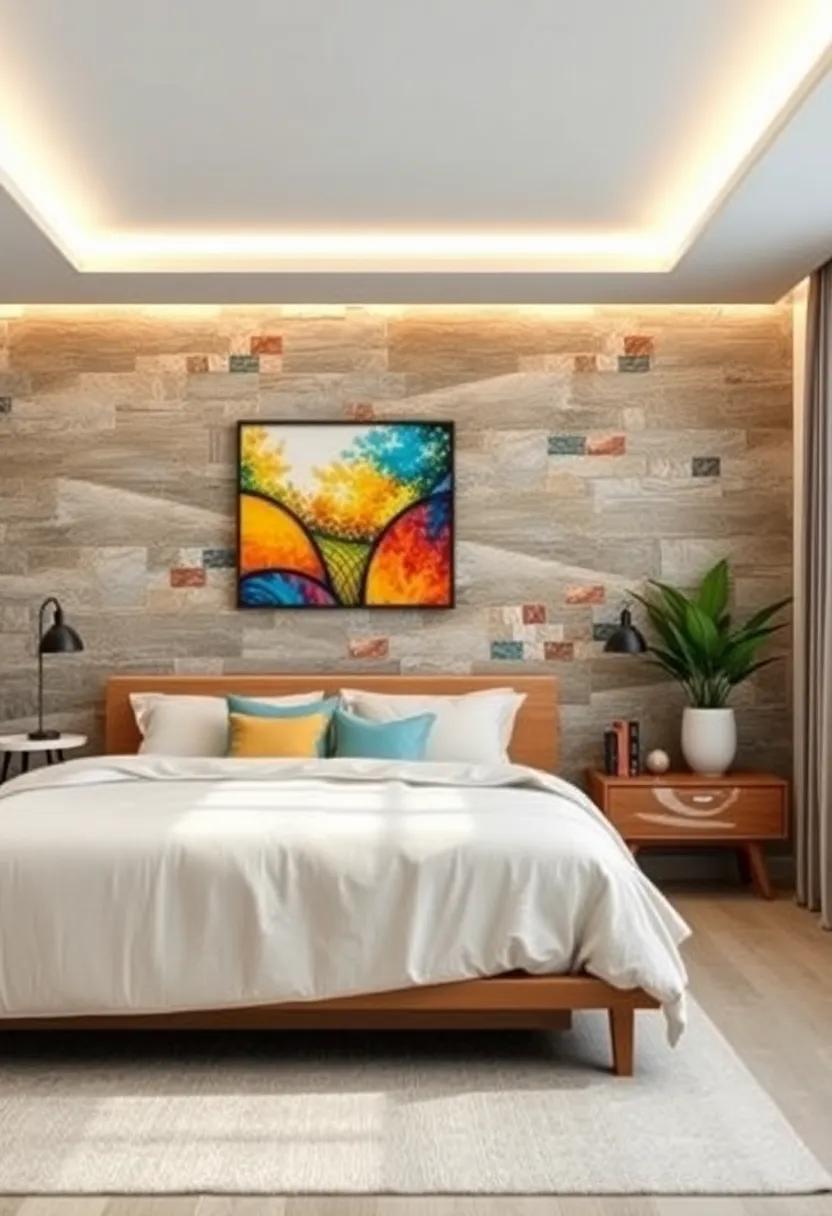Textured Panels: Add depth with textured wood or metal panels, showcasing artwork that complements the tactile feel and enhances the cozy atmosphere of your bedroom