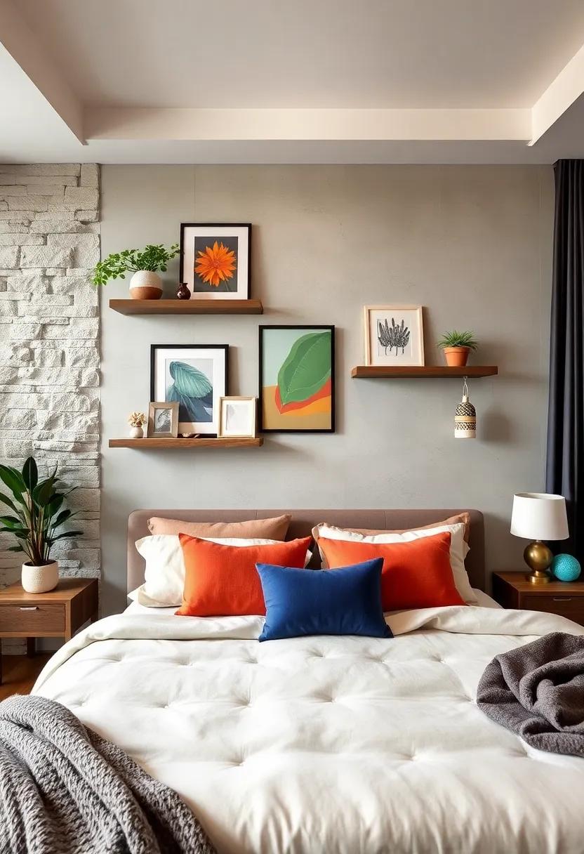 Transform your accent wall into a dynamic canvas by integrating floating shelves that serve as both functional storage and artistic display. These shelves allow you to create a personalized gallery that reflects your style and interests. Consider mixing and matching the following elements to keep your arrangement fresh and intriguing:
