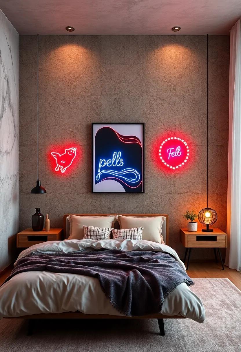 Transform your bedroom into an enchanting sanctuary with vibrant neon signs that serve as both whimsical art and effective lighting. Picture a glowing “Dream Big” sign illuminating your nightstand or a funky “Good Vibes Only” neon piece adorning your accent wall, instantly uplifting the atmosphere. The bright colors and playful shapes can act as a focal point, drawing the eye and setting the tone for a cozy, chic retreat. Not only do these signs provide soft light for reading or nighttime relaxation, but they also create a unique wall display that reflects your personality.
