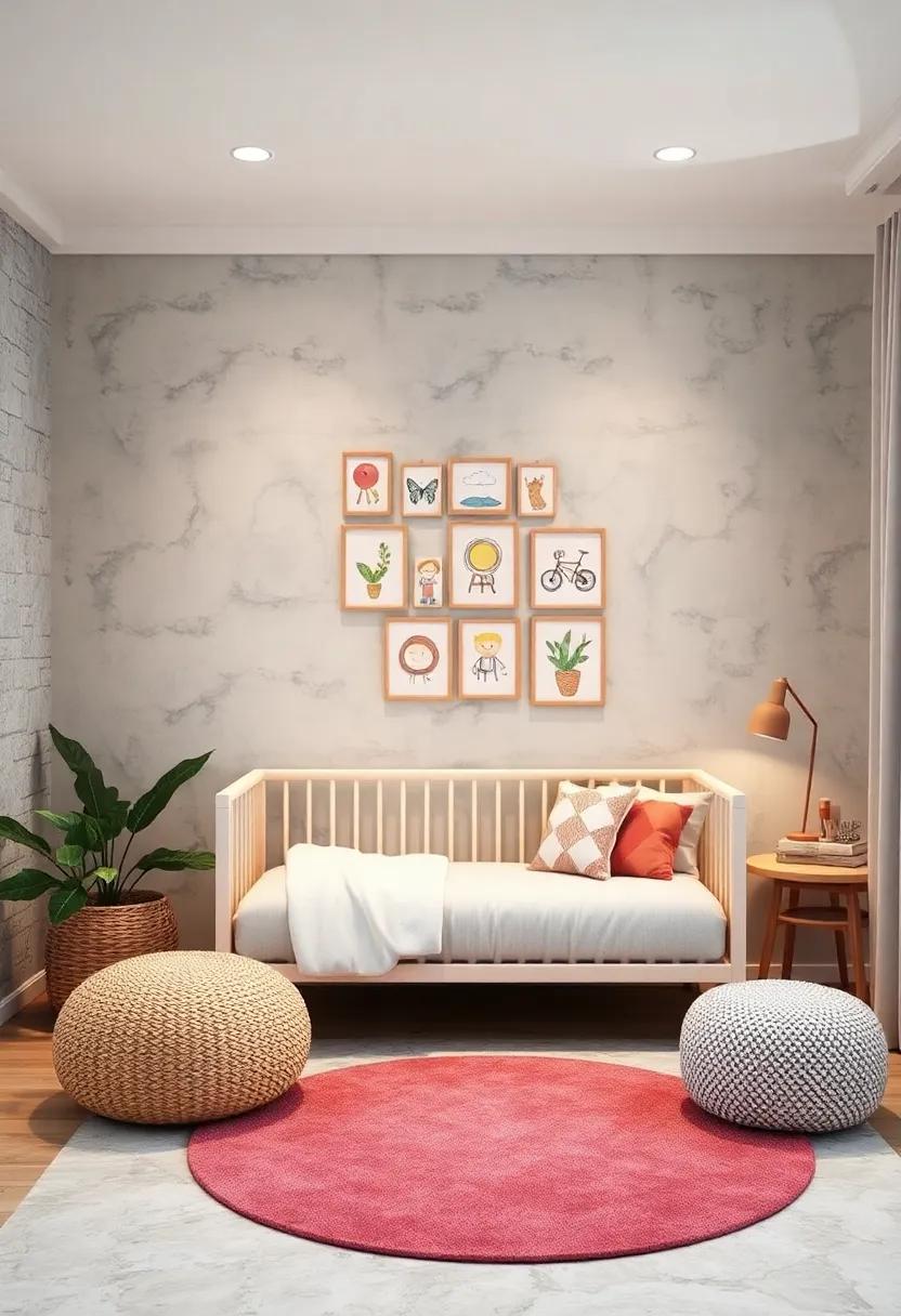 To further personalize the space, consider adding interactive elements to the gallery wall. Use washi tape to create a rotating display area where new art can be easily swapped in and out. Incorporate small shelves or clips to showcase 3D projects or sculptures. String lights can be draped around the artwork to give it a cozy atmosphere, while a chalkboard section allows your child to continually add their artistic mark. This dynamic and changing gallery not only decorates the nursery but also encourages a love for art, fostering your child’s creativity as they grow.