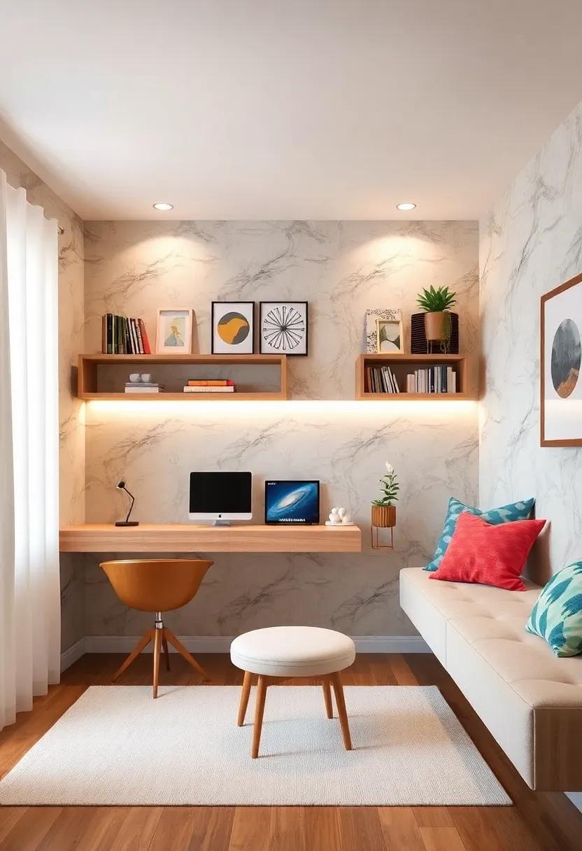 additionally, integrating a small table for display items can complement the floating desk perfectly.