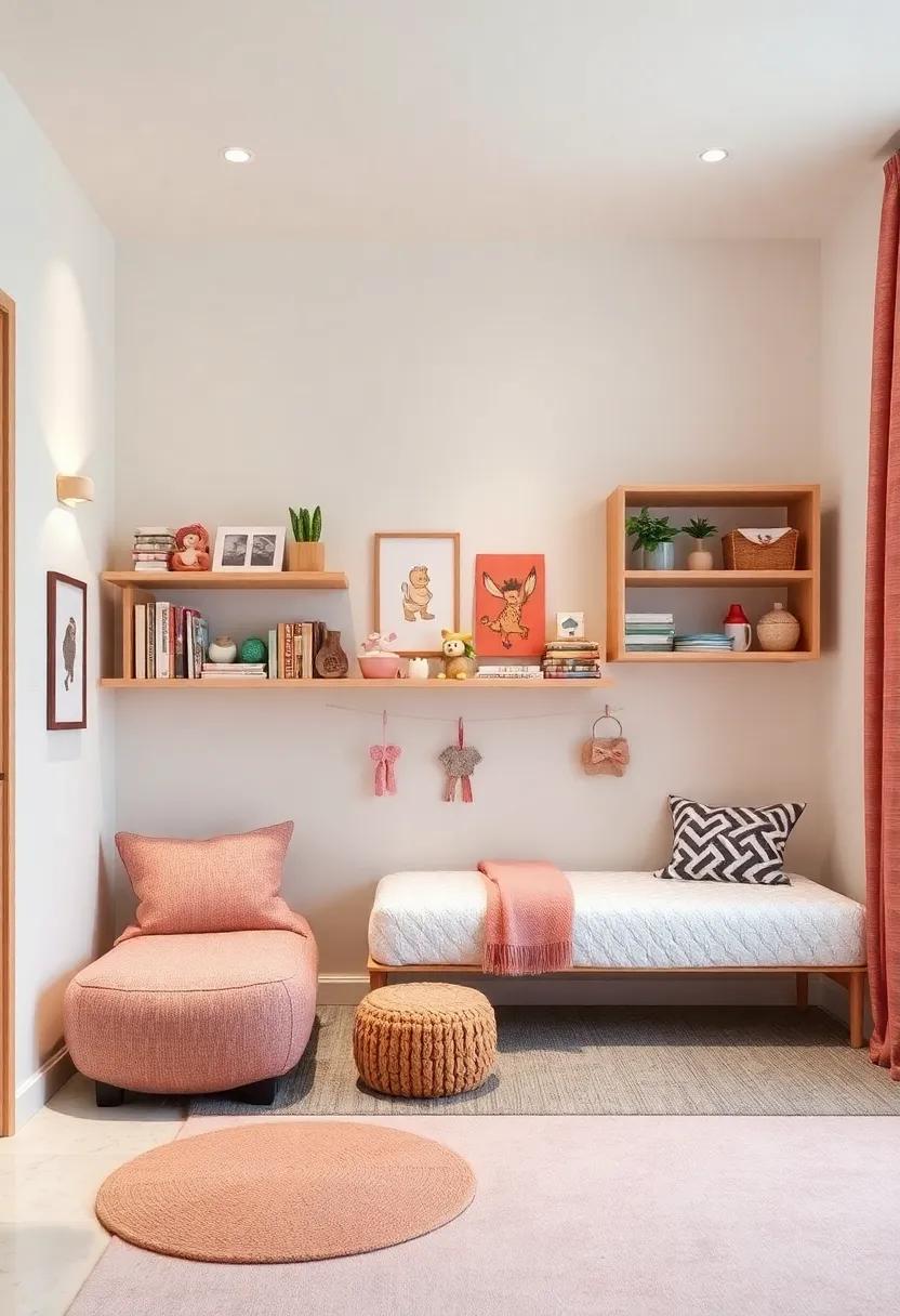 Utilize Vertical Space: Install shelves high up to store toys and books, keeping the floors clear and the room feeling spacious