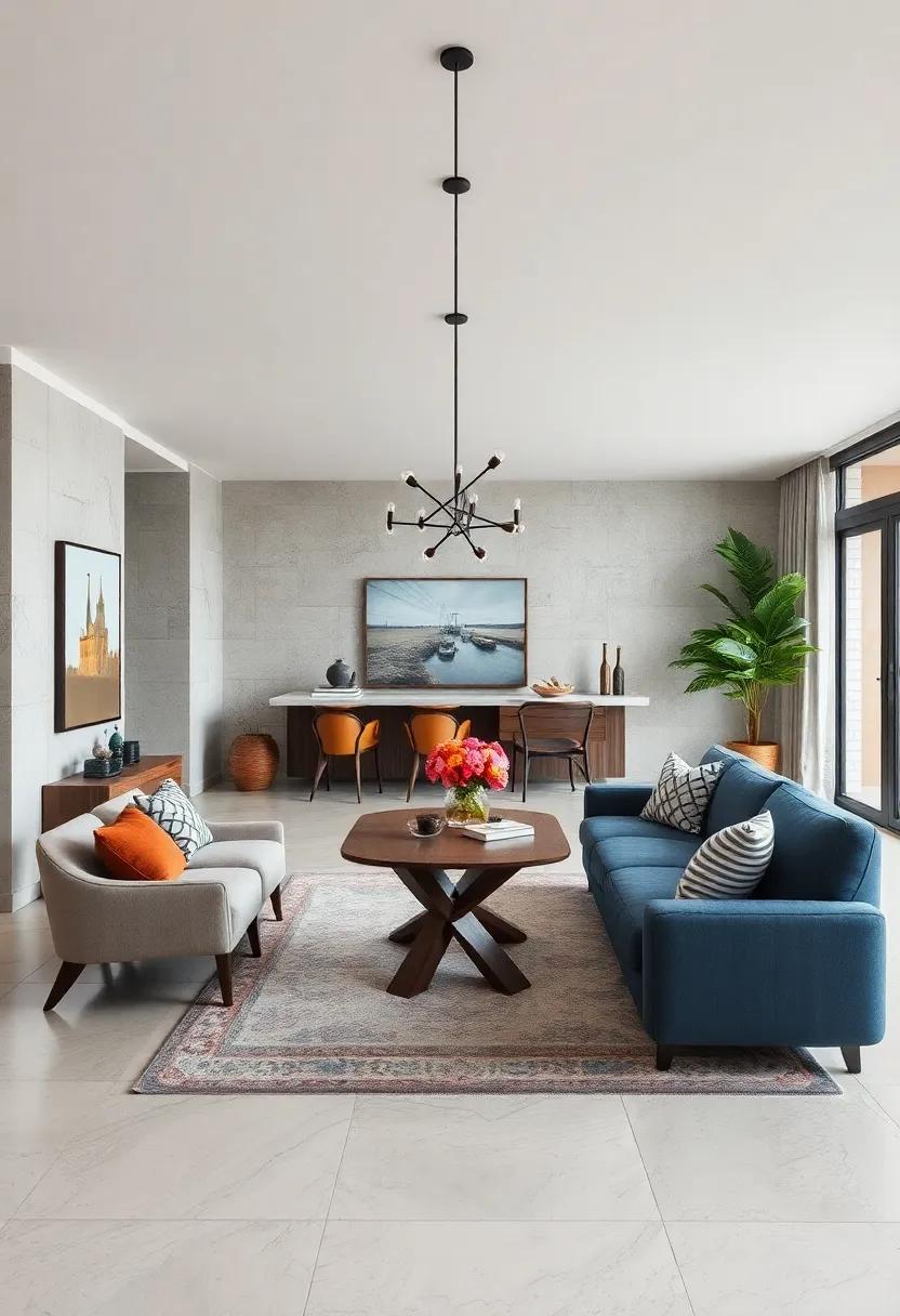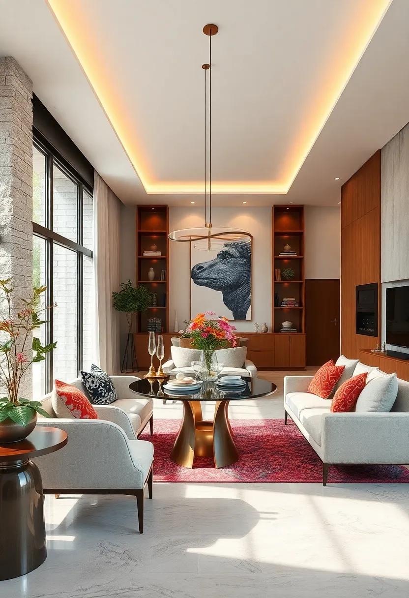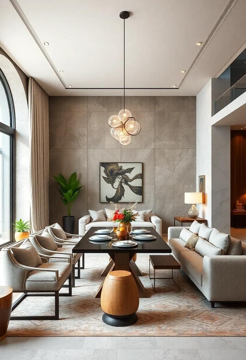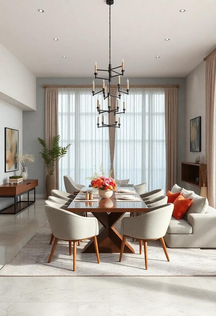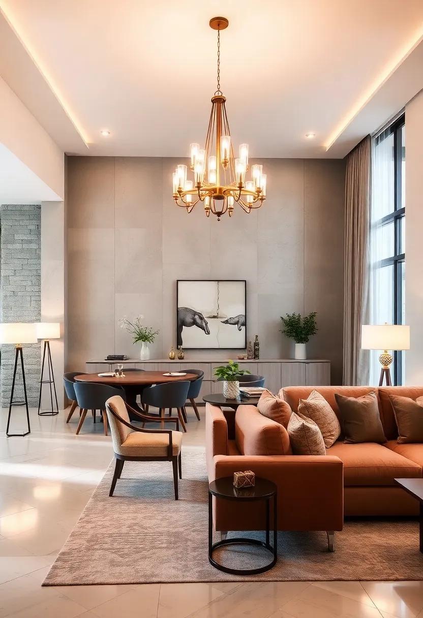 Statement Lighting: Illuminate both areas with a striking chandelier over the dining table paired with stylish floor lamps in the living room for a chic look