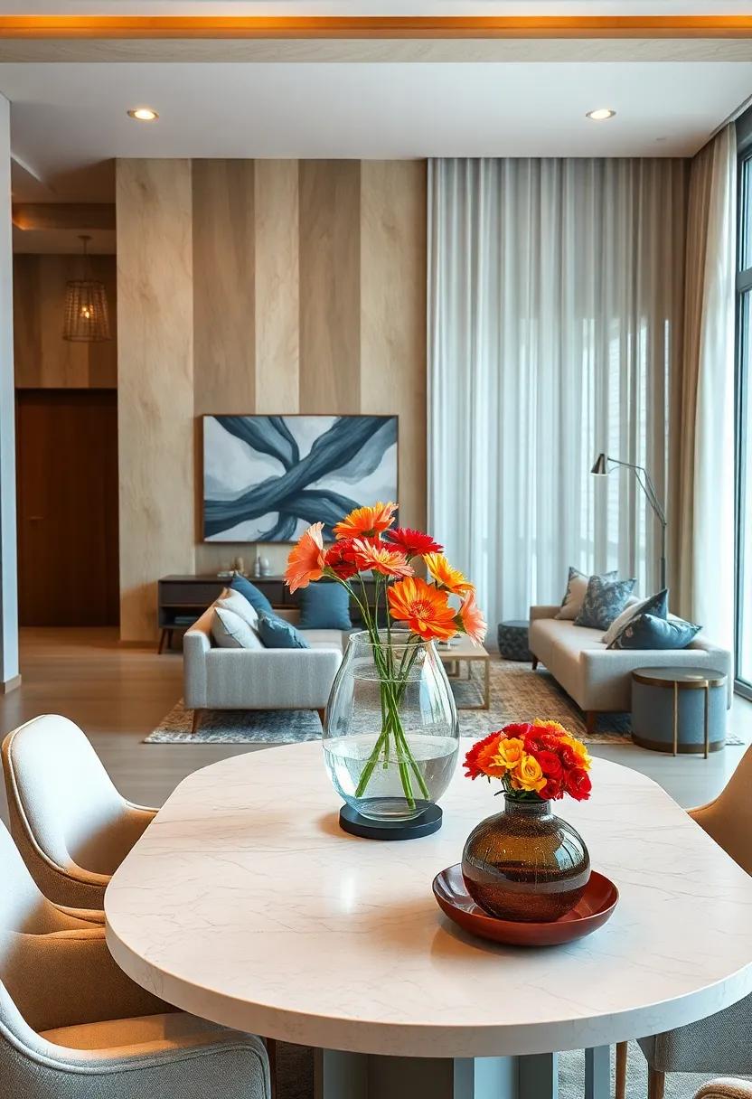 Transforming your dining and living room combo into a vibrant sanctuary can be as simple as introducing an array of plants and fresh flowers. Potted plants such as ferns, snake plants, or pothos can add lush greenery without overwhelming your space. For a chic modern look, consider using sleek plant stands or hanging planters, which not only elevate your plant display but also save valuable floor space. Pair them with colorful vases filled with fresh-cut flowers—think sunflowers, tulips, or peonies—to create stunning focal points on your dining table or coffee table.