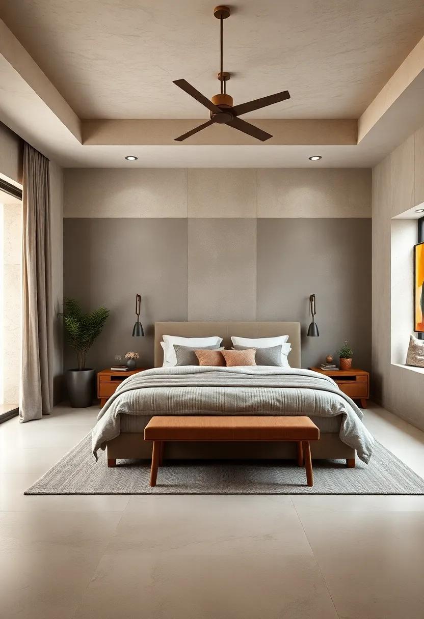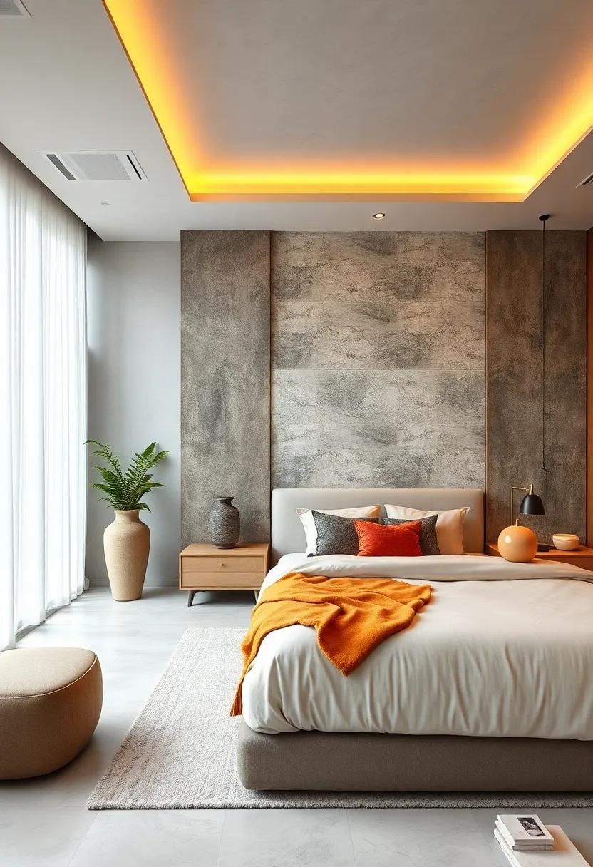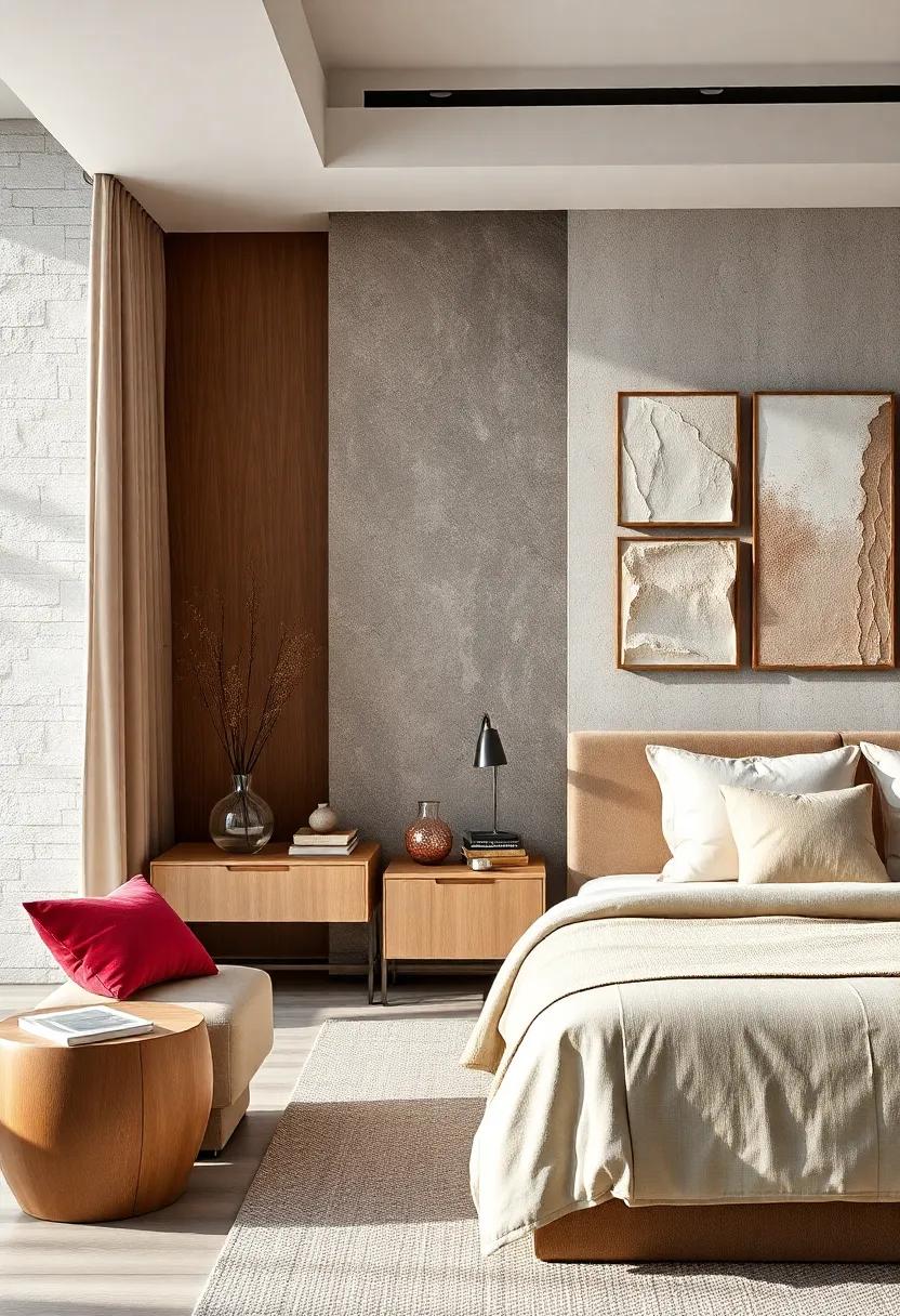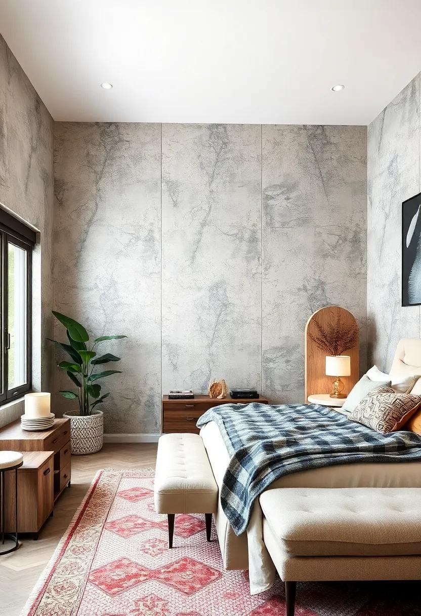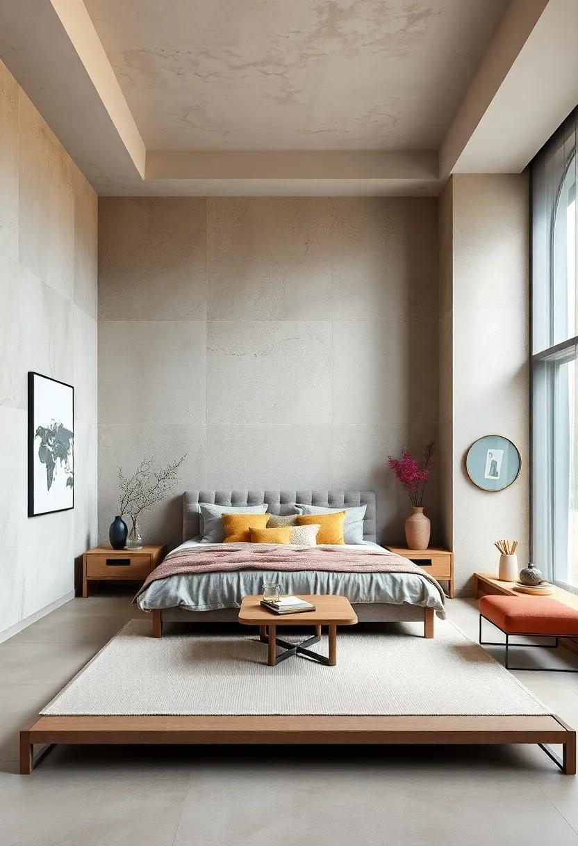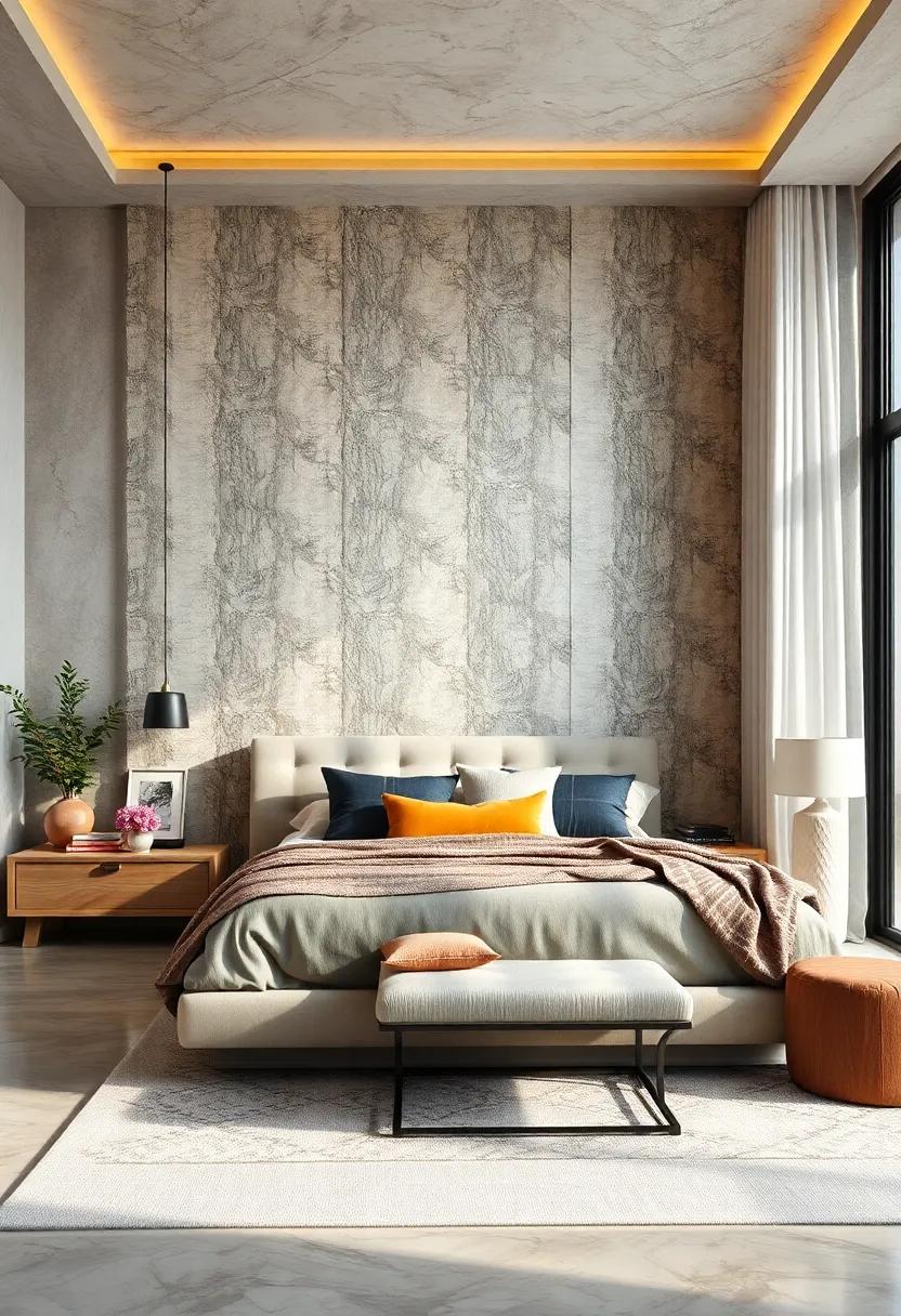 Consider the captivating allure of a brushed concrete wall in your master bedroom. Its raw texture brings a refined, industrial charm that contrasts beautifully with softer elements in the room. Imagine pairing this minimalist backdrop with plush bedding and luxurious throws. The juxtaposition of hard and soft creates a visually stunning harmony that is both inviting and stylish. Think about accentuating the concrete’s cool tones with warm wooden elements, such as a reclaimed wood headboard or side tables, to create a cozy atmosphere that invites relaxation.