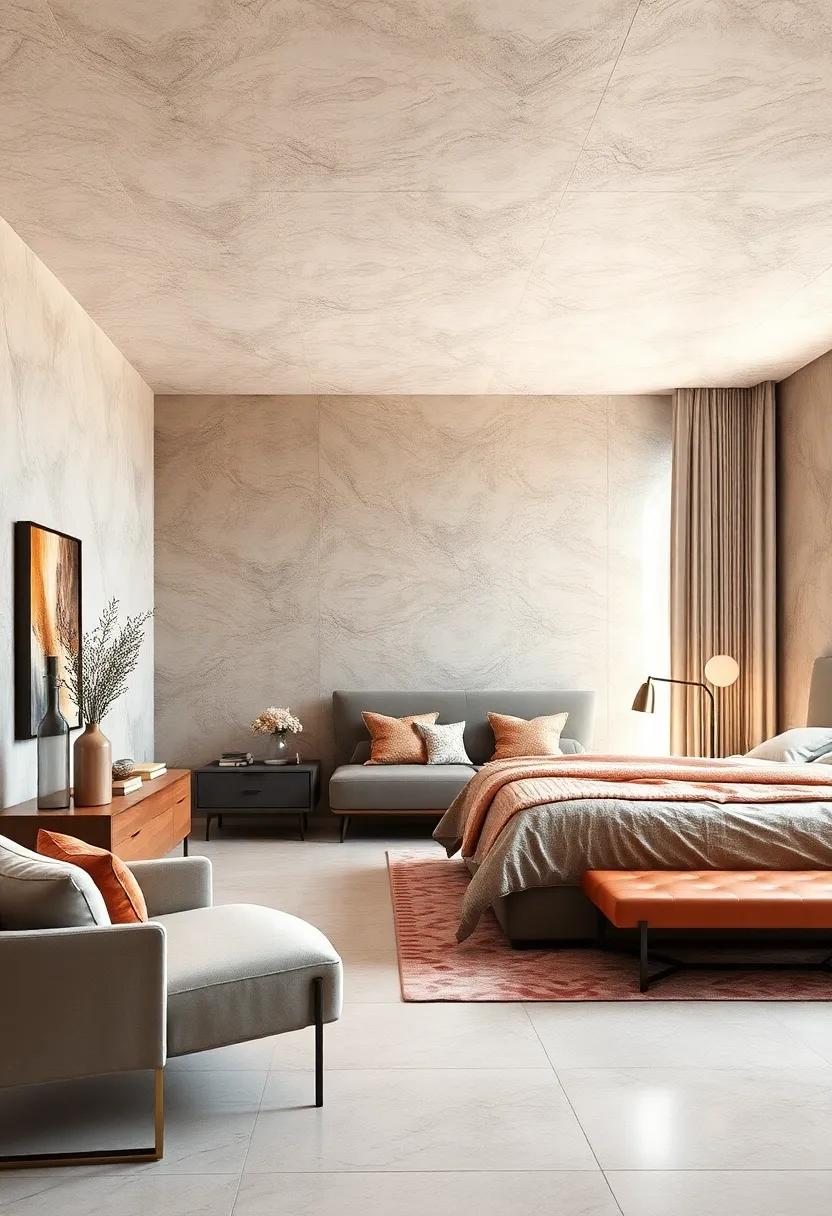 Transform your master bedroom into a sanctuary by incorporating a faux stucco treatment on your walls. This design choice allows you to achieve a textured, artisan appeal that captures the essence of natural materials without the high maintenance. The earthy tones and tactile surface create a warm atmosphere, inviting relaxation and comfort. Pairing this finish with carefully chosen decor will further enhance the handcrafted look, reflecting your unique style.Imagine the tranquility of waking up to a space that feels both sophisticated and grounded.