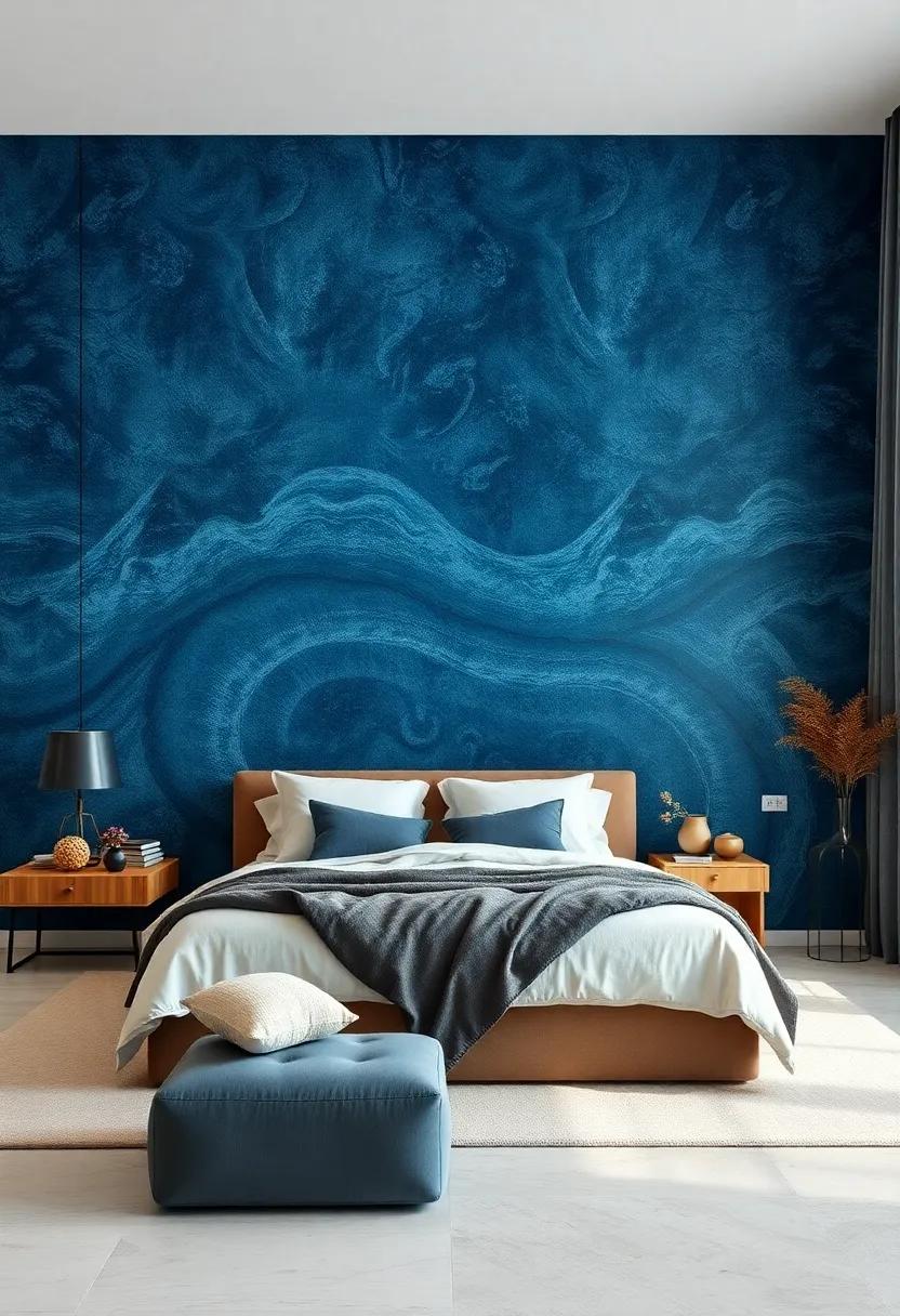Dive into the dramatic effect of a bold, deep blue textured wallpaper that transforms your space into a peaceful ocean oasis, perfect for relaxation