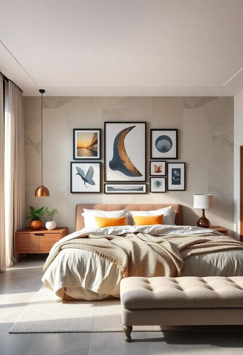 A well-curated gallery wall can transform your bedroom into a personal sanctuary filled with stories and inspiration. Start by choosing a theme that resonates with your personality-be it travel, family, or an artistic journey. Mix and match a variety of framed art, cherished photographs, and even three-dimensional objects like small sculptures or textiles. The key is to maintain a balance between color and texture; use a cohesive color palette to tie everything together while allowing for different materials to add depth. Consider incorporating unexpected shapes to keep the eye moving, arranging pieces at varying heights to create a dynamic visual flow.