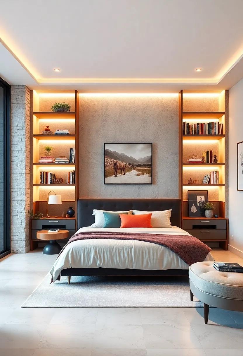 Designate a specific section of your wall as an inspiring gallery that invites admiration. Arrange your artwork using a gallery wall layout to create depth and interest, playing with different sizes and orientations. You can even include small shelves to display art books or mementos that resonate with your journey. Consider using spotlights or decorative LED strips to highlight your curated collection, adding an artistic glow that heightens the ambiance. Don’t be afraid to refresh your displays seasonally, allowing your bedroom to evolve continuously while keeping it truly personal.