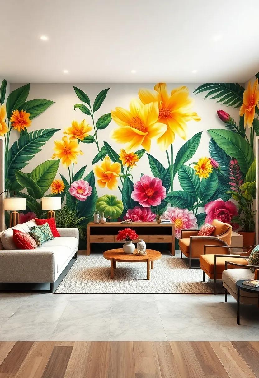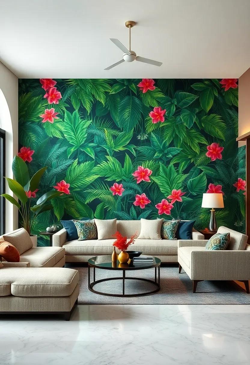 Tropical Paradise: Infuse your living room with the vibrant hues of a tropical rainforest, complete with lush green foliage and bright flowers that transport you to a sunny getaway