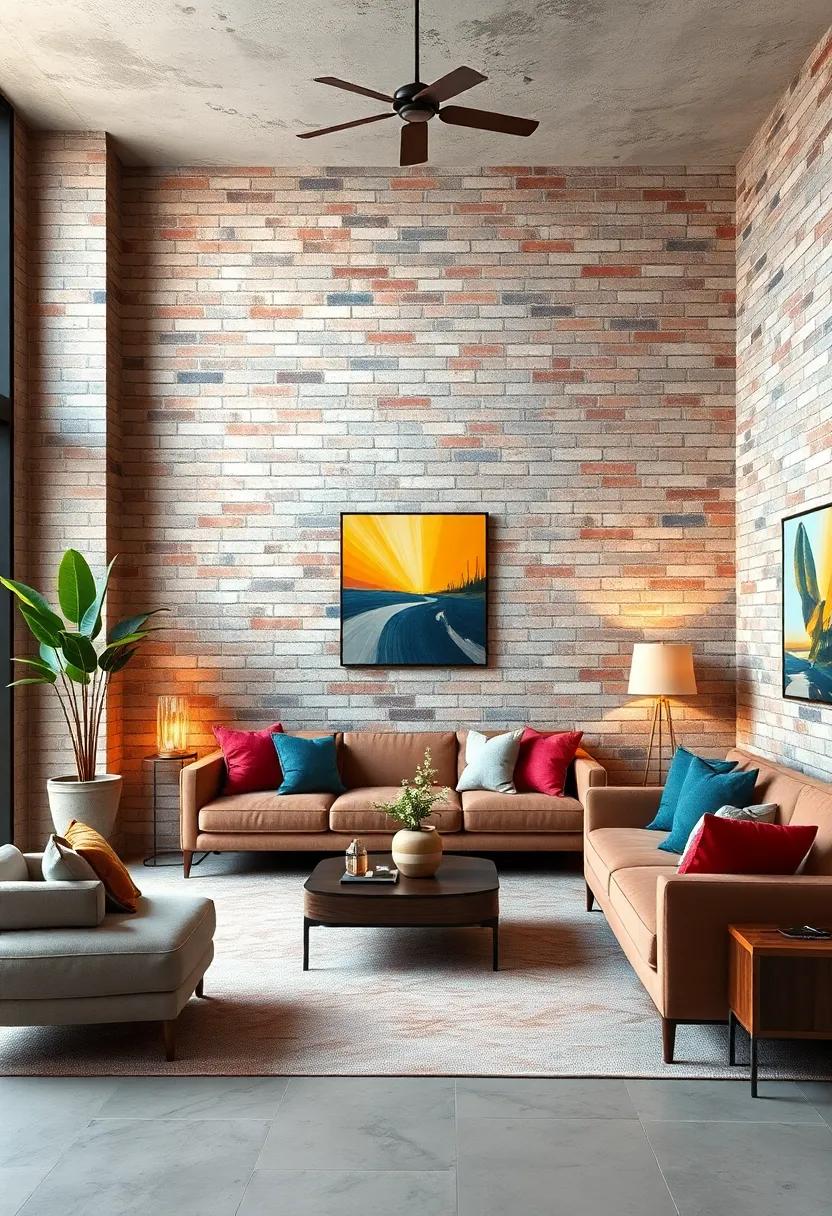 To further accentuate the industrial theme, you can incorporate elements like oversized pendant lights and reclaimed wood pieces that harmonize with the wall treatment. Supplying contrast is key here-play with rich jewel tones in your textiles to complement the neutrality of the wallpaper. By layering different materials, such as soft fabrics against the hard surfaces of the brick or concrete, you create a dynamic space that invites both comfort and style. Below are some creative ideas to enhance your area: