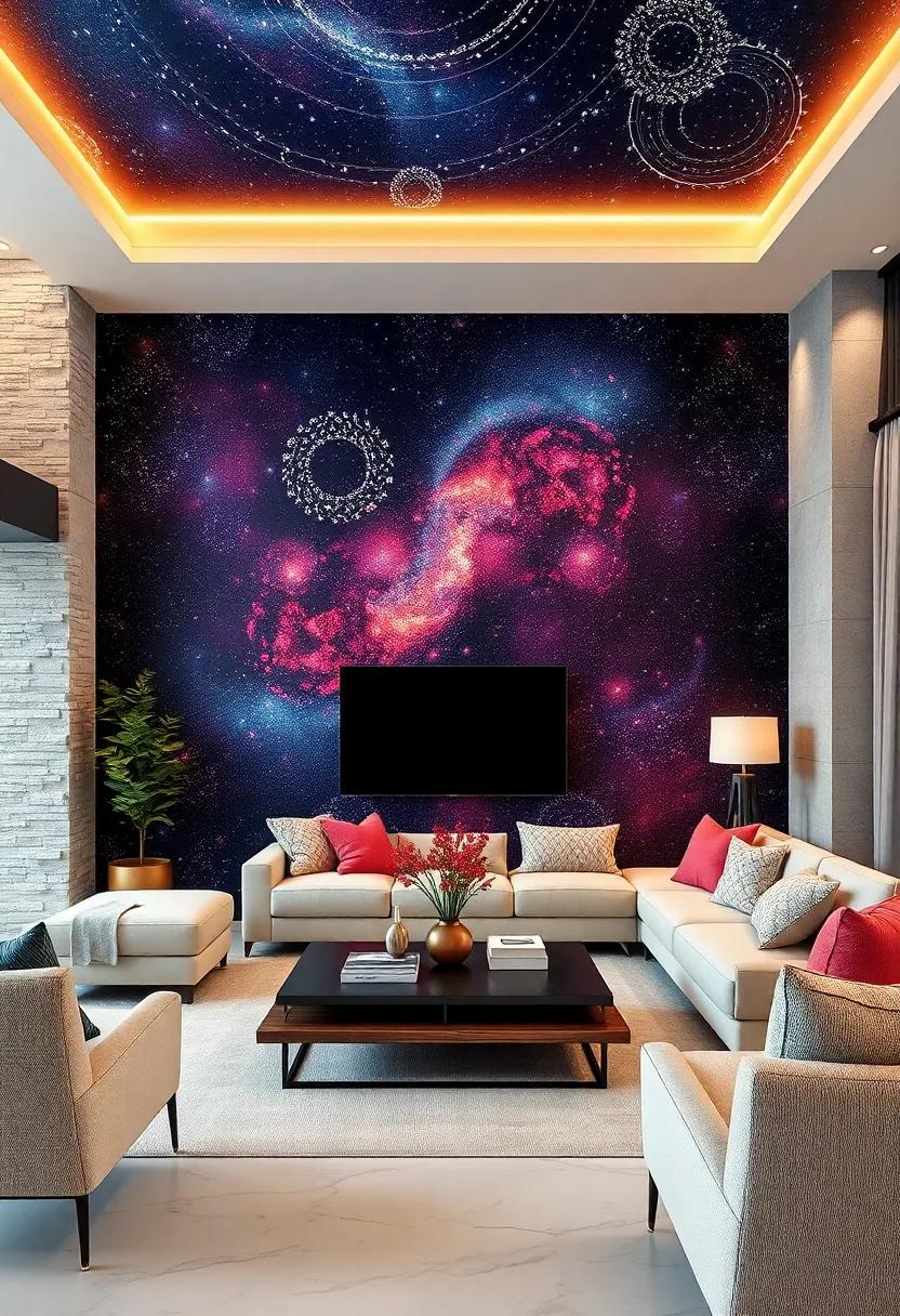 Celestial Designs: Bring the beauty of the night sky into your living room with starry patterns or galaxy-themed wallpaper that fosters a sense of wonder