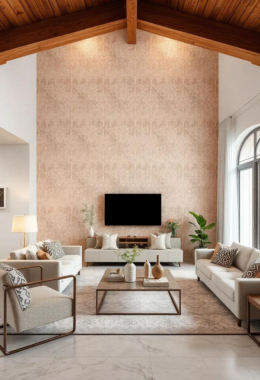 Transform your living room into a serene retreat by infusing the space with warm earth tones reminiscent of natural desert landscapes. Think soft terracotta and sandy beiges that evoke the soothing hues of a sunset over the dunes. Layer these colors through your wallpaper selection with rich textures that mimic organic elements like layered rock formations or the delicate grains of desert sand. To enhance the cozy yet chic feel, incorporate bold patterned cacti designs that draw the eye and bring a sense of whimsy to the room, allowing the wallpapers to serve as a vibrant backdrop for your furniture and decor.