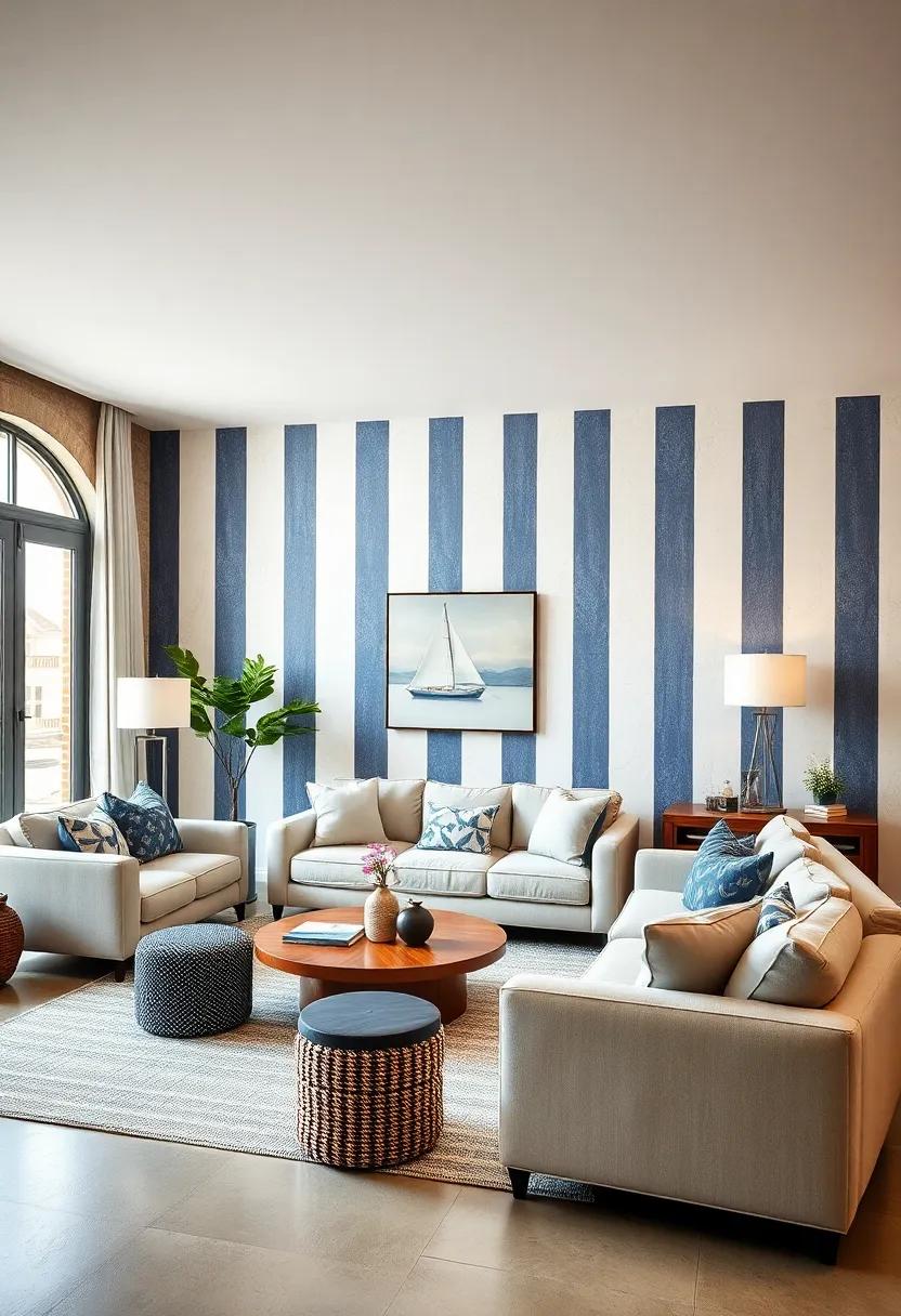 For an added dimension to your decor, consider pairing your striped wallpaper with vibrant, airy decor elements. Accent your navy and white palette with pops of coral, sandy beige, or fresh seafoam green for a layout that feels both lively and serene. Use decorative items like nautical-themed cushions, artistic wall hangings depicting marine life, or even delicate glass vases shaped like sea vessels. This approach not only enhances the aesthetic but also embraces the charm of seaside living, making your living room a delightful homage to the serene wonder of coastal life.