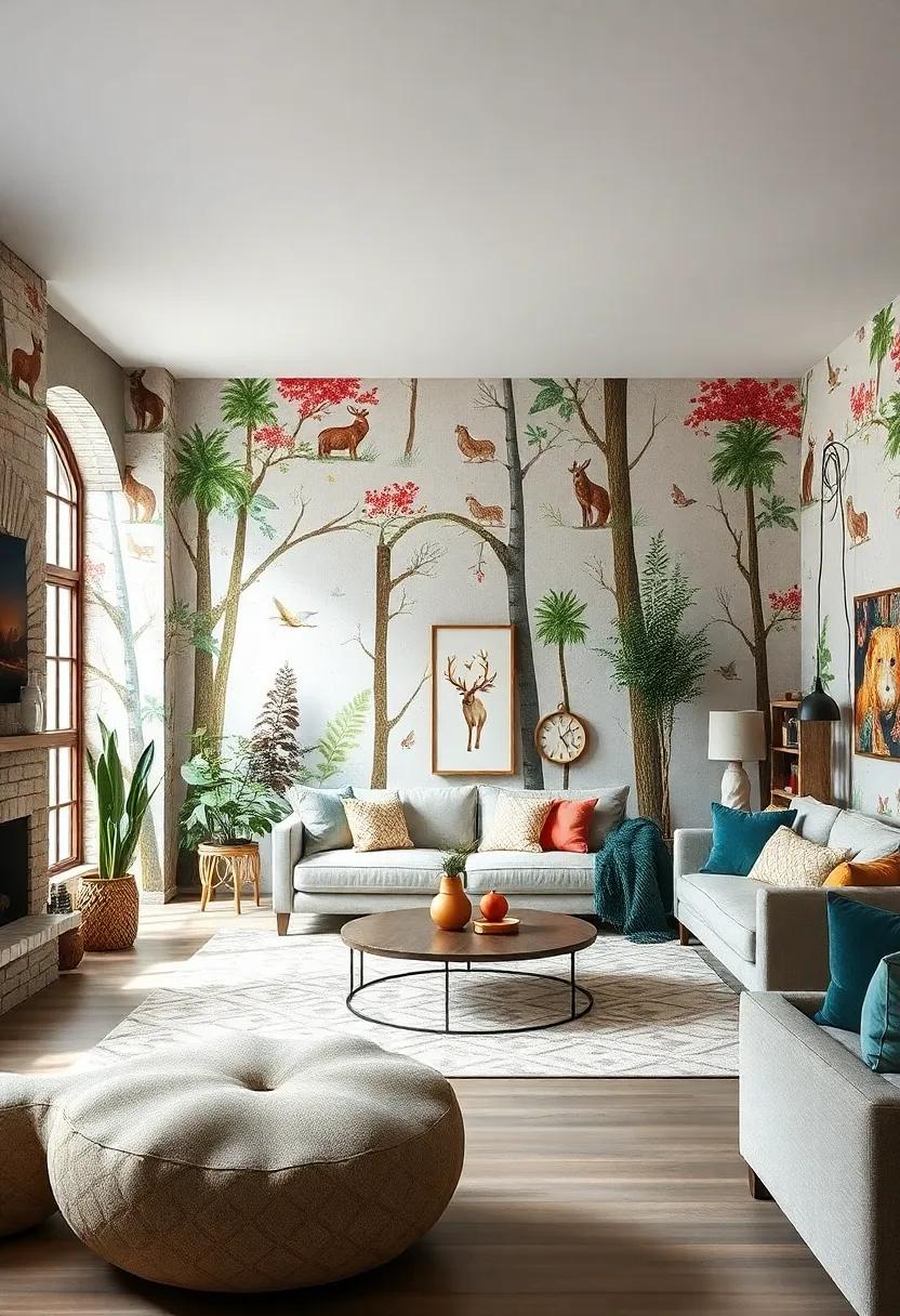 The enchanting allure of the forest can effortlessly translate into your living room through whimsical wallpaper designs that evoke a sense of tranquility and connection with nature. imagine being surrounded by lush green trees, delicate ferns, and playful woodland creatures that dance across your walls. This style invites a serene atmosphere, where both vibrant hues and muted tones can mirror the beauty of the great outdoors. consider wallpaper that features intricate illustrations of foxes, owls, or deer, complementing your furniture choices and soothing color palette. The textures you can achieve through such designs can bring depth to your space, making it feel as if a slice of the woodland has been transported indoors, creating an inviting retreat for relaxation and reflection.