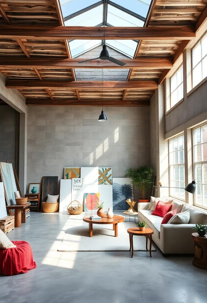 An art studio filled with natural light and an exposed wood ceiling, designed to inspire creativity with its raw yet refined look