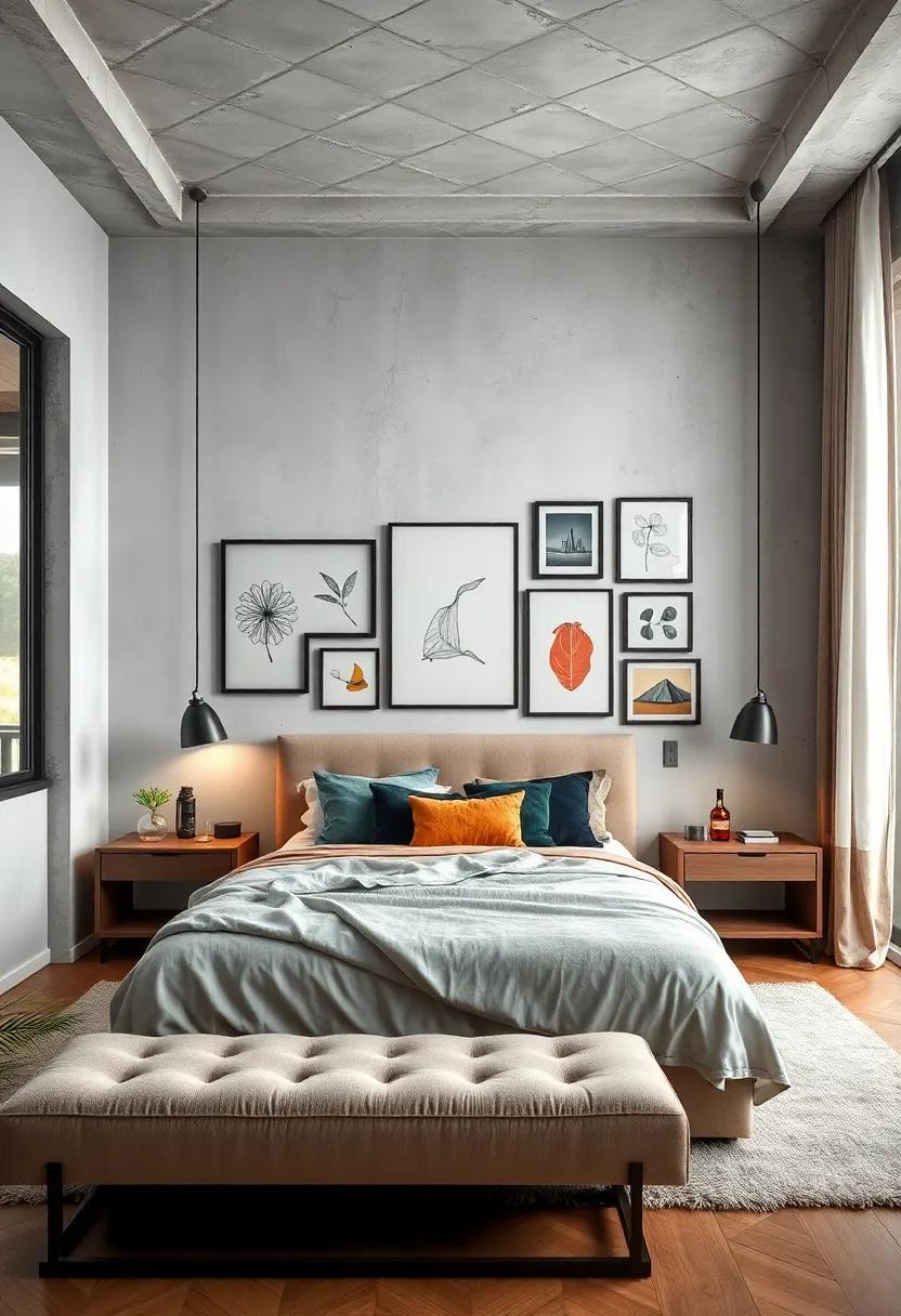 An artistic bedroom that incorporates a gallery wall with industrial art, showcasing personality against a clean, modern backdrop