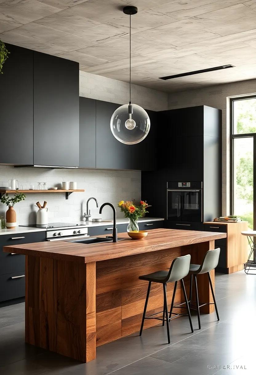 A contemporary kitchen with an island crafted from reclaimed wood, where matte black cabinetry offsets the gleam of stainless steel finishes