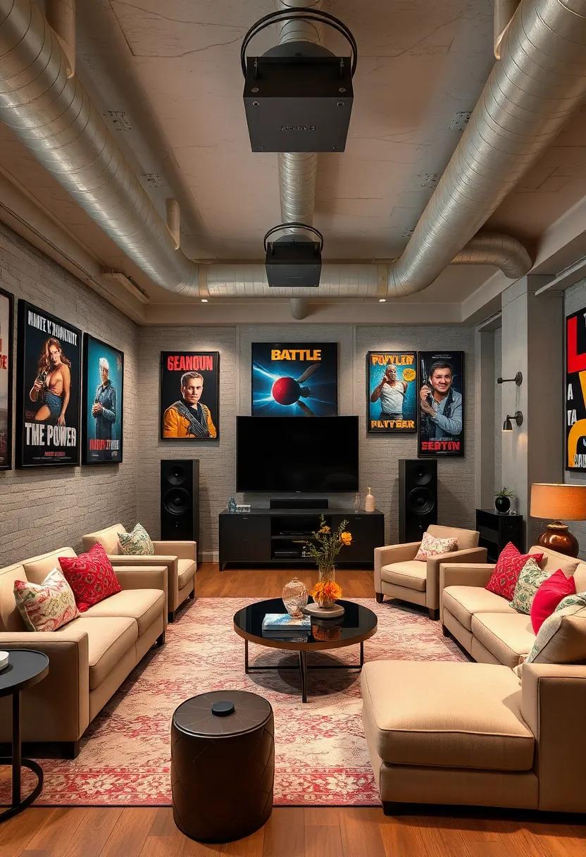 An eclectic media room that fuses vintage movie posters with modern sound equipment, all under exposed ductwork that adds a touch of flair