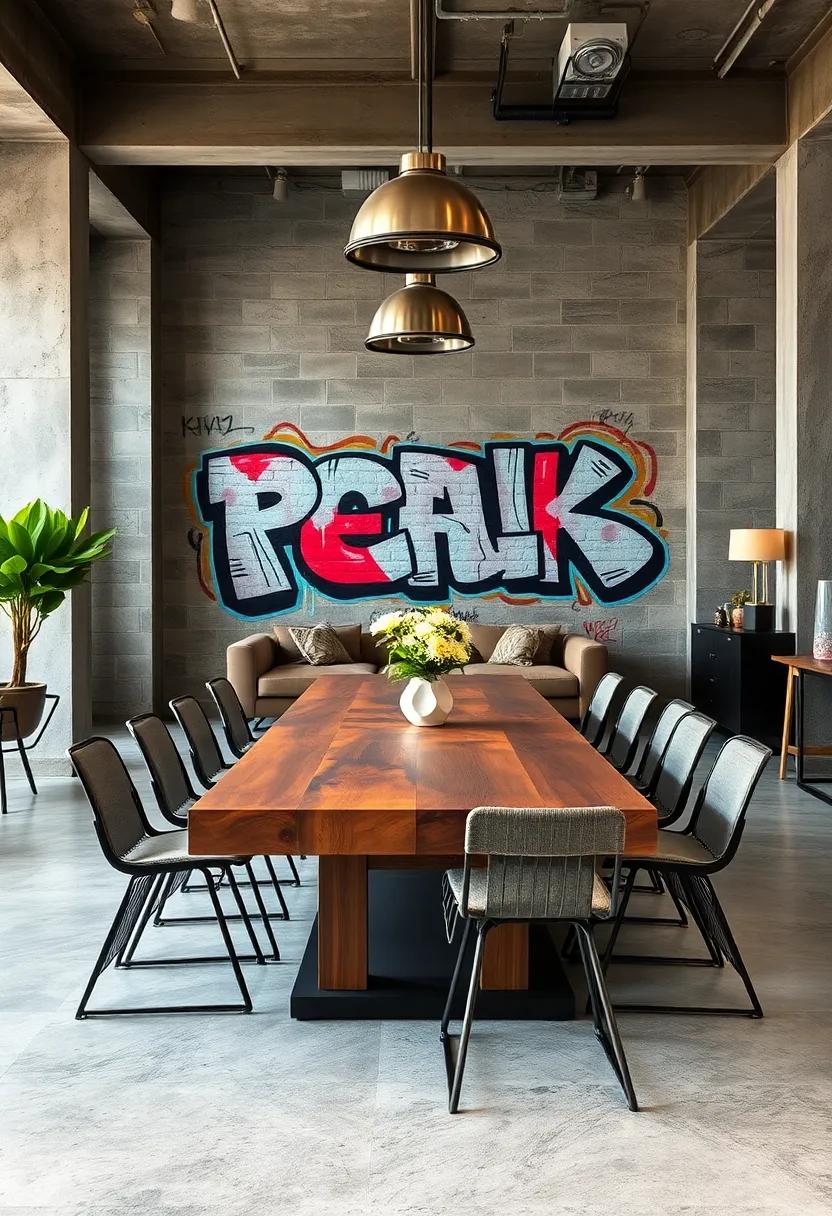 As your gaze shifts to the backdrop, striking graffiti art bursts to life on the walls, infusing an urban edge that juxtaposes beautifully with the refined furnishings. Bold colors and intricate designs tell a story of creativity and passion, invigorating the space with energy and vibrancy. Such artistic details invite lively conversation and the sharing of ideas, making this dining area not only a place to eat but a haven for social connection. In this harmonious blend, every element works together, showcasing how industrial design can be both luxurious and rich with narrative.