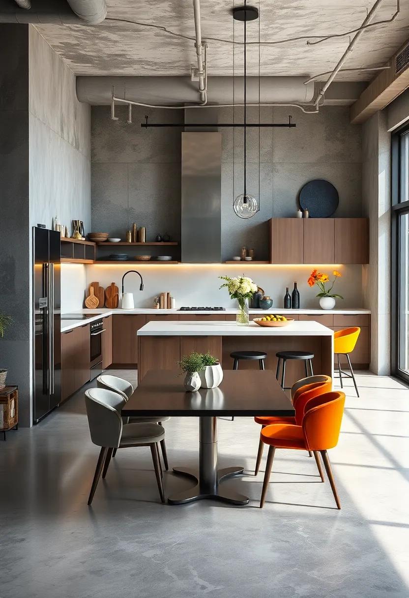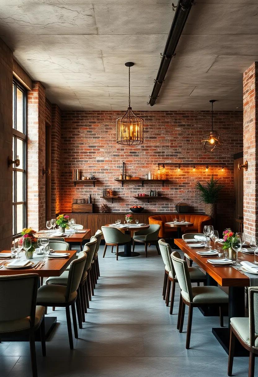 This dining area also embraces an inviting yet sophisticated atmosphere, where every element contributes to an unforgettable dining experience. The seating arrangement, often featuring upholstered chairs with metal legs or sleek bar stools, invites guests to linger. Textures come together beautifully, with soft cushions contrasting against the sturdy surfaces of brick and wood. A bespoke bar cart, decked with premium glassware and artisanal spirits, offers a dash of flair and accessibility. The overall aesthetic embodies a union of industrial charm and luxurious comfort,making each meal not just a meal but an elevated experience steeped in style.