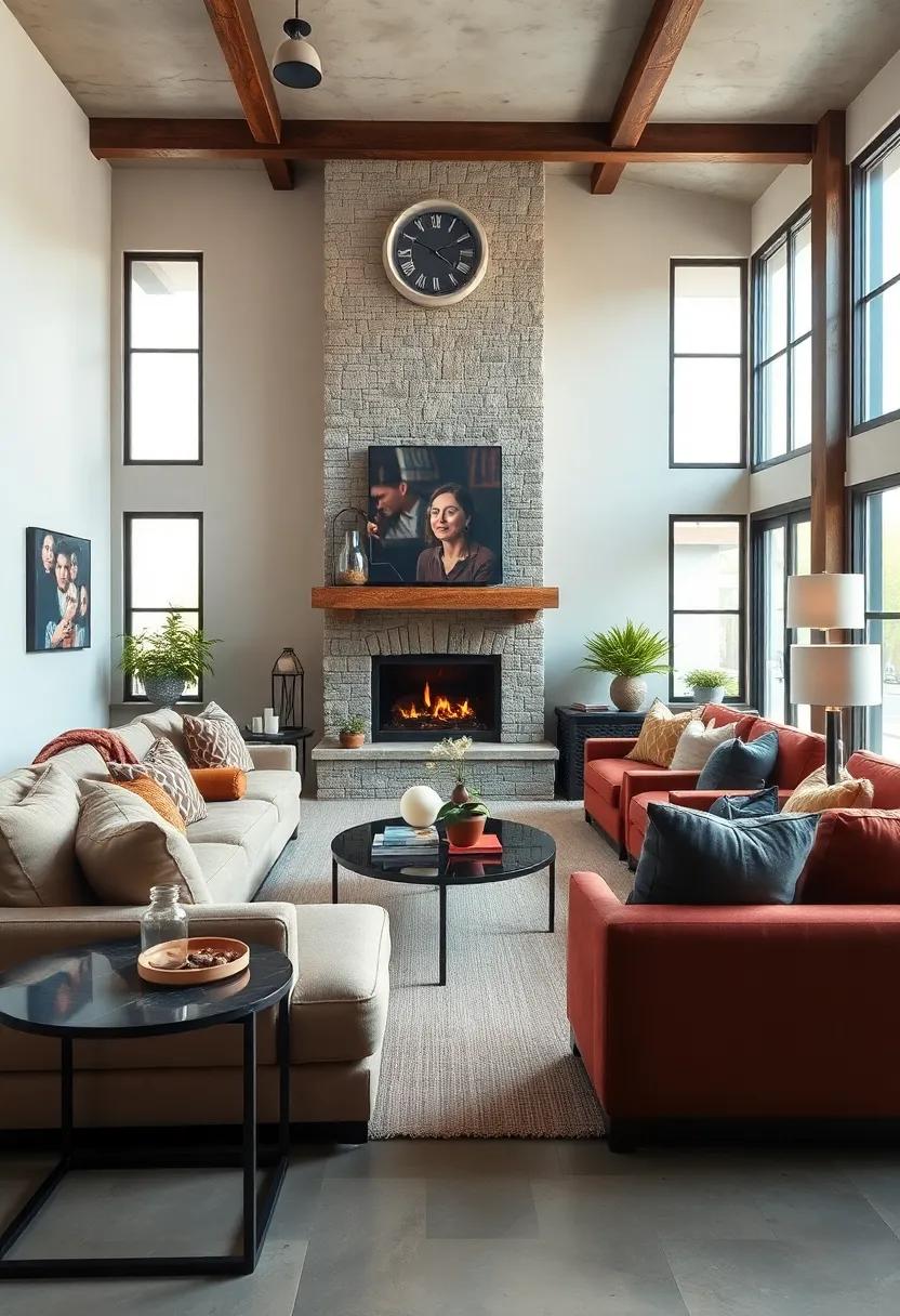 A family room that celebrates comfort with oversized furniture, complemented by a rugged stone fireplace that anchors the industrial theme
