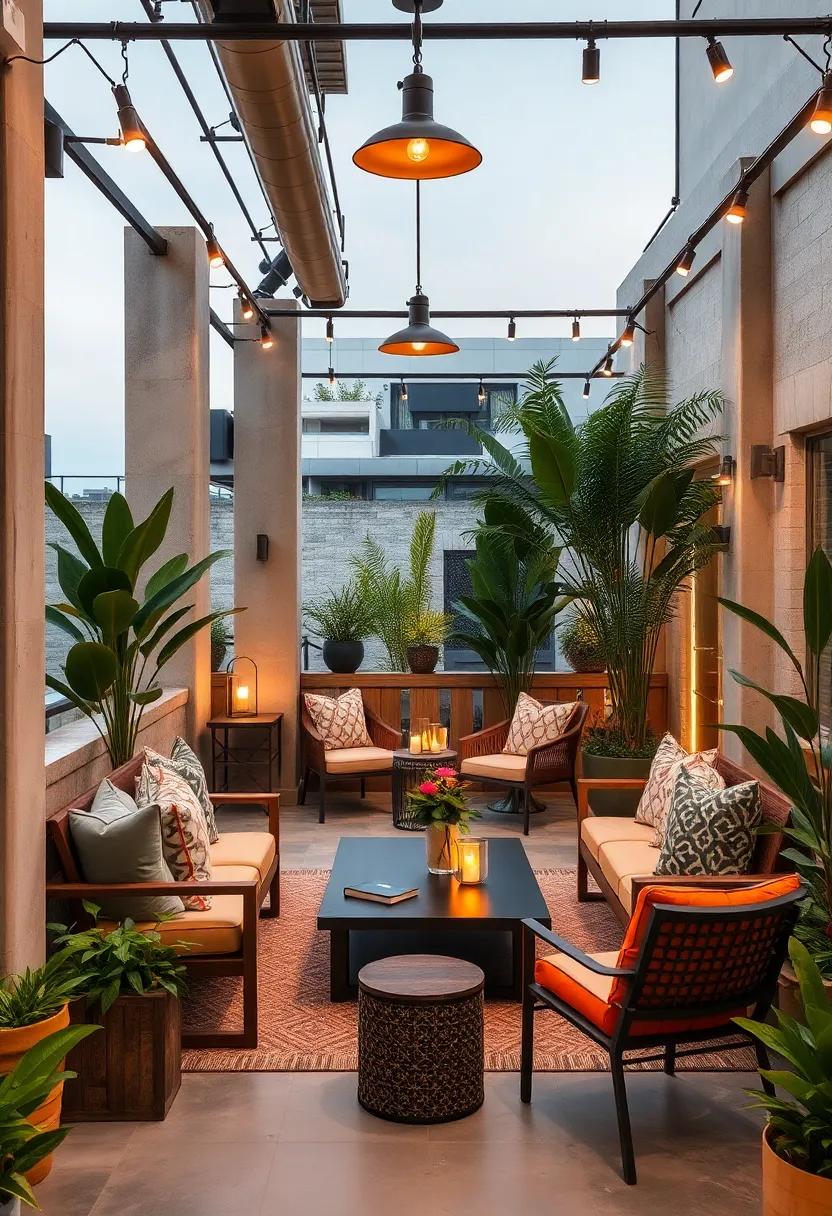 A gorgeous terrace adorned with industrial lighting and lush greenery, offering a serene escape while maintaining a modern, sophisticated edge