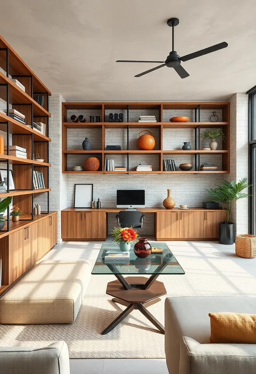 A home office that combines open shelving of raw wood with sleek glass desks, designed for creativity and productivity amidst industrial charm