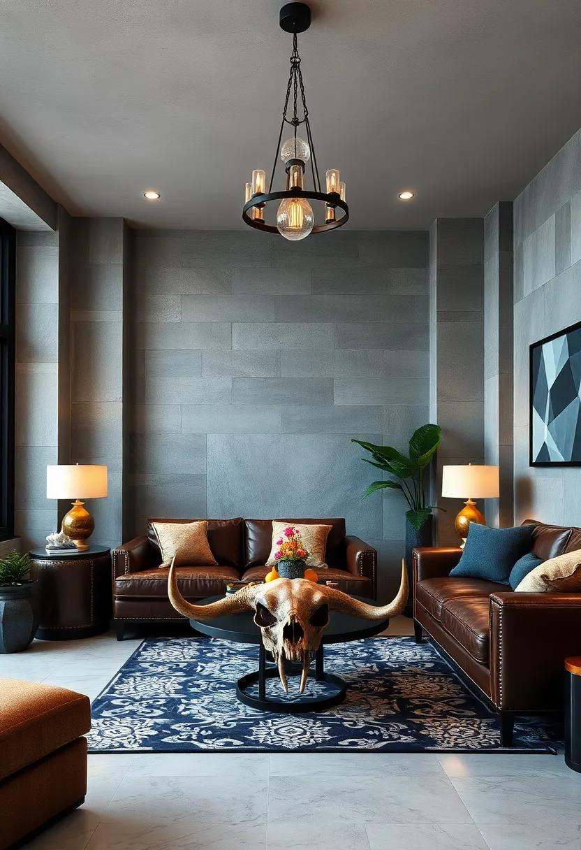 embracing the aesthetics of modern design, this inviting living area boasts luxurious soft leather couches that promise comfort and style. The warm tones of the leather harmonize beautifully with the industrial elements of the space. Here, polished finishes contrast with rugged decor; sleek metal accents and raw wooden textures come together to create an intriguing balance that captivates the eye. The room invites you to sink into relaxation,while the unique skull-themed coffee table serves as a bold centerpiece,merging elegance and edginess effortlessly.Its artistic design sparks conversation and adds a distinct character to the room.