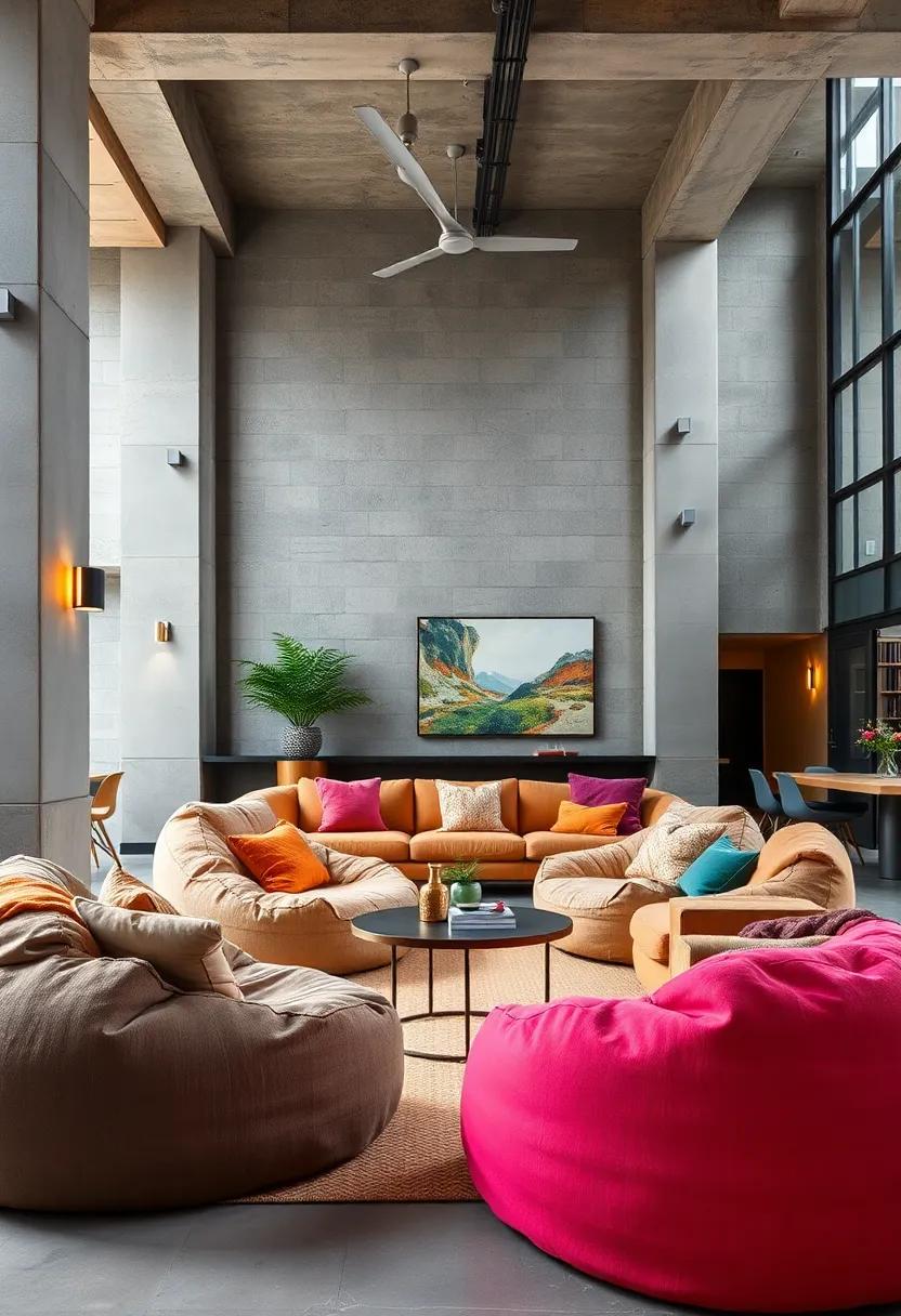 A lavish lounge area featuring oversized bean bags, accentuating comfort in an industrial setting where relaxation meets sophistication