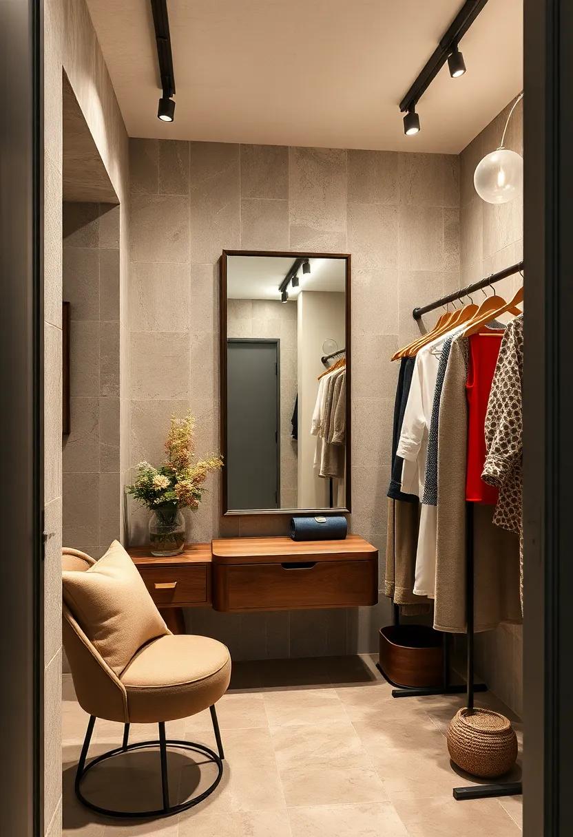 A luxe dressing room complete with an industrial-inspired mirror and chic clothing racks, providing the perfect blend of function and style