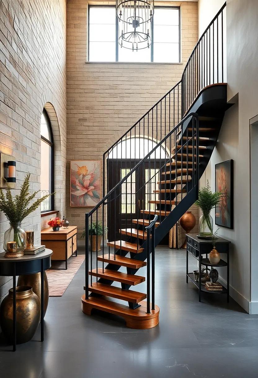 Complementing the staircase, the surrounding decor plays a pivotal role in amplifying the luxurious industrial vibe. Elements such as exposed brick walls, refined wrought-iron fixtures, and soft ambient lighting seamlessly interact with the staircase’s bold design. To further highlight this captivating first impression, consider adding touches like large greenery, a chic console table, or artwork that echoes the staircase’s materials and colors. This thoughtful integration creates a layered effect, ensuring that the entryway is not just a passage but a memorable transition into your stylish abode.