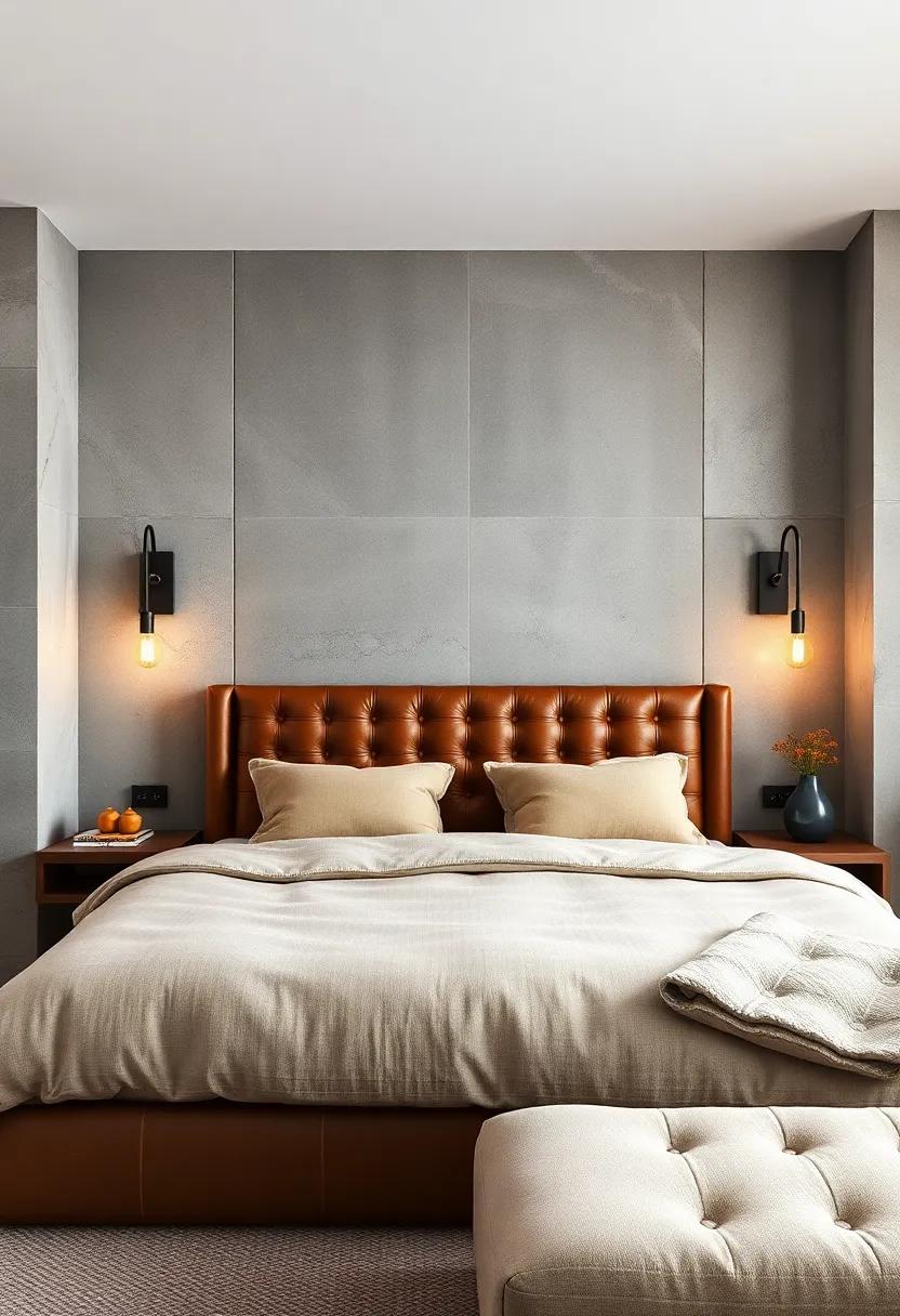 A sophisticated bedroom with a tufted leather headboard and Edison bulb sconces, creating a cozy, luxurious retreat in a minimalist setting