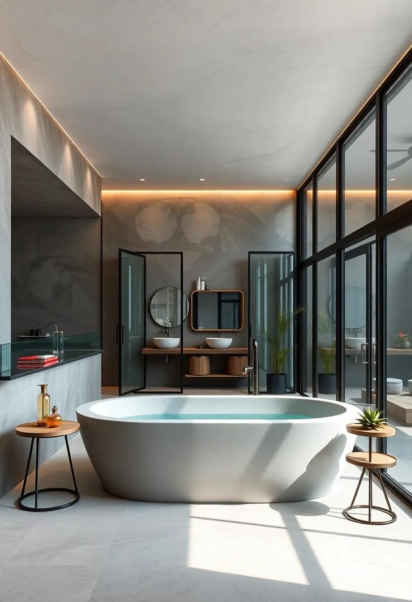 A stylish bathhouse that blends luxury and minimalism, where glass partitions encase a lavish soaking tub in a backdrop of industrial elegance