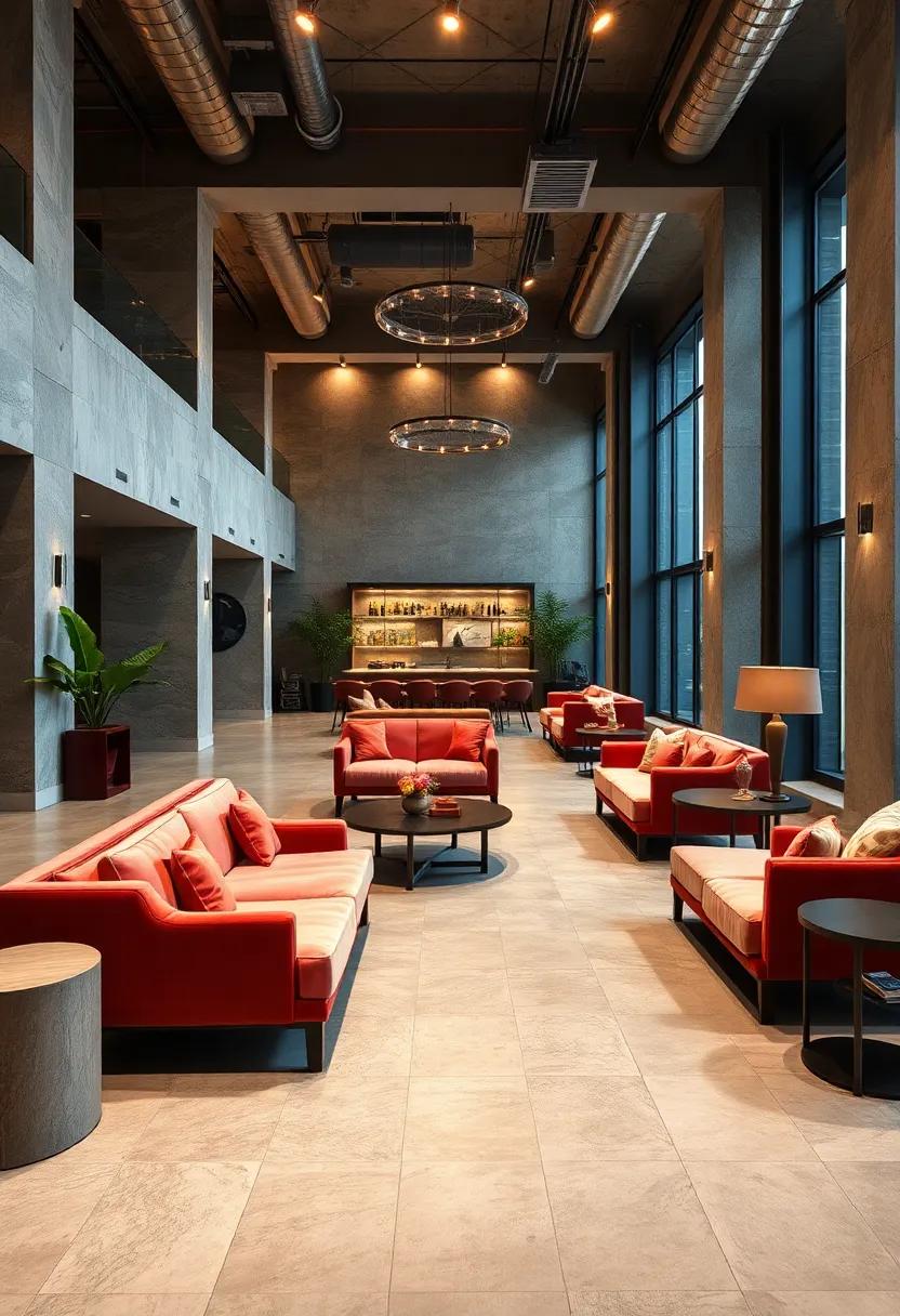 Stepping into this boutique hotel lobby is like entering a carefully curated art gallery, where every detail speaks to both opulence and innovation. The plush velvet seating wraps guests in comfort, contrasting beautifully against the polished concrete floors that gleam under soft, ambient lighting. This juxtaposition creates a scene that is both inviting and daring, making it a perfect backdrop for casual conversations or quiet moments of reflection. Stylish brass accents and unique sculptures pepper the space, further enhancing its vibrant yet sophisticated atmosphere.