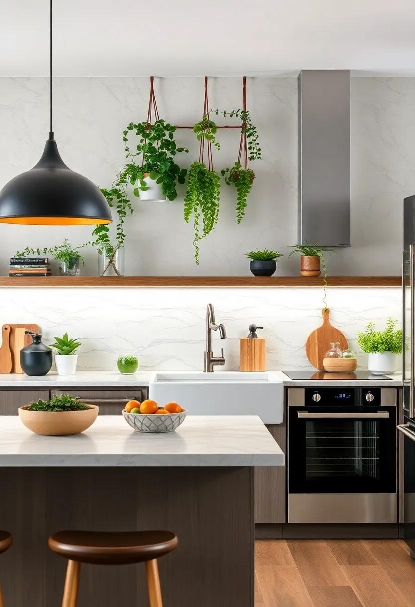 Hanging Botanical Decor: Integrate living greenery alongside your backsplash for a fresh and organic touch that connects your kitchen to nature